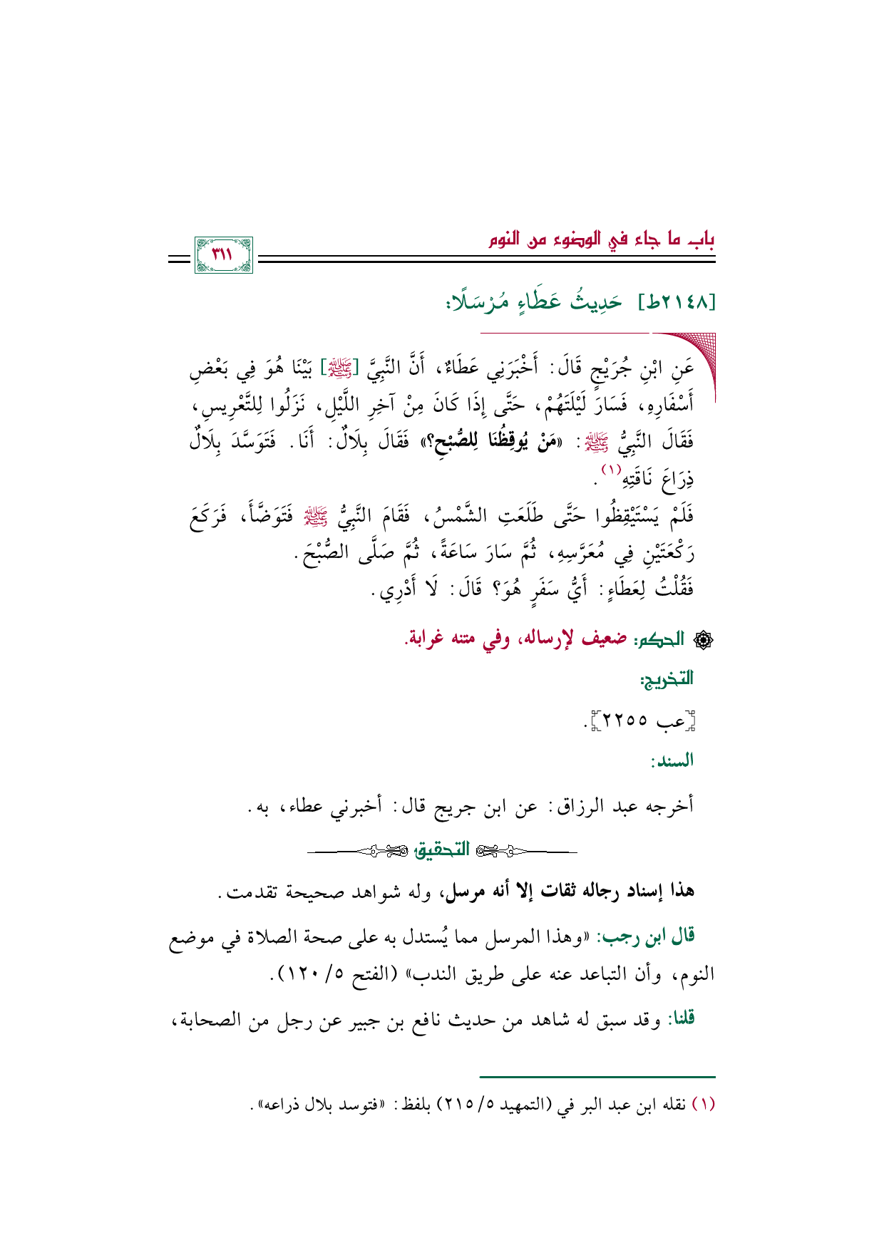 (¬١) - نقله ابن عبد البر في (التمهيد ٥/ ٢١٥) بلفظ: "فتوسد بلال ذراعه".
