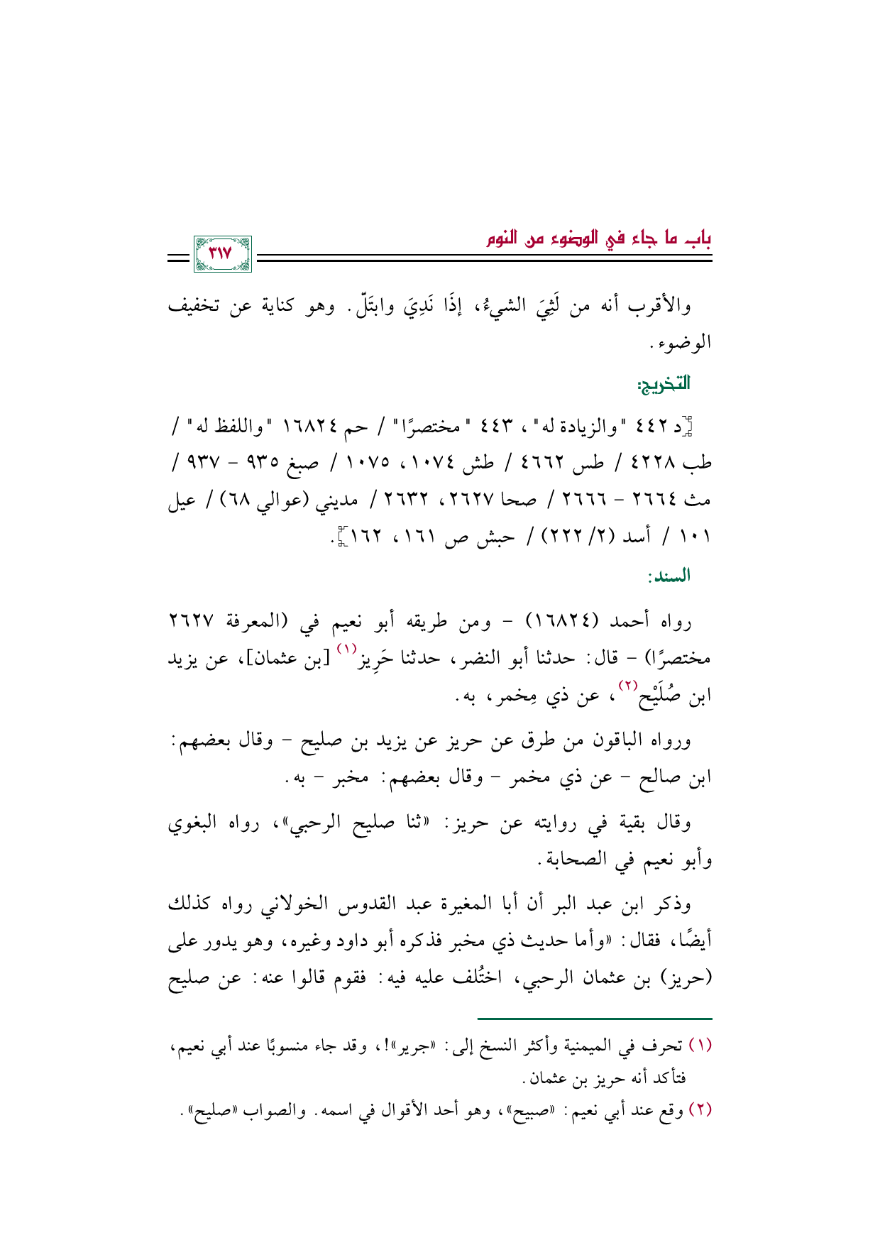 (¬١) - تحرف في الميمنية وأكثر النسخ إلى: "جرير"! ، وقد جاء منسوبًا عند أبي نعيم، فتأكد أنه حريز بن عثمان.