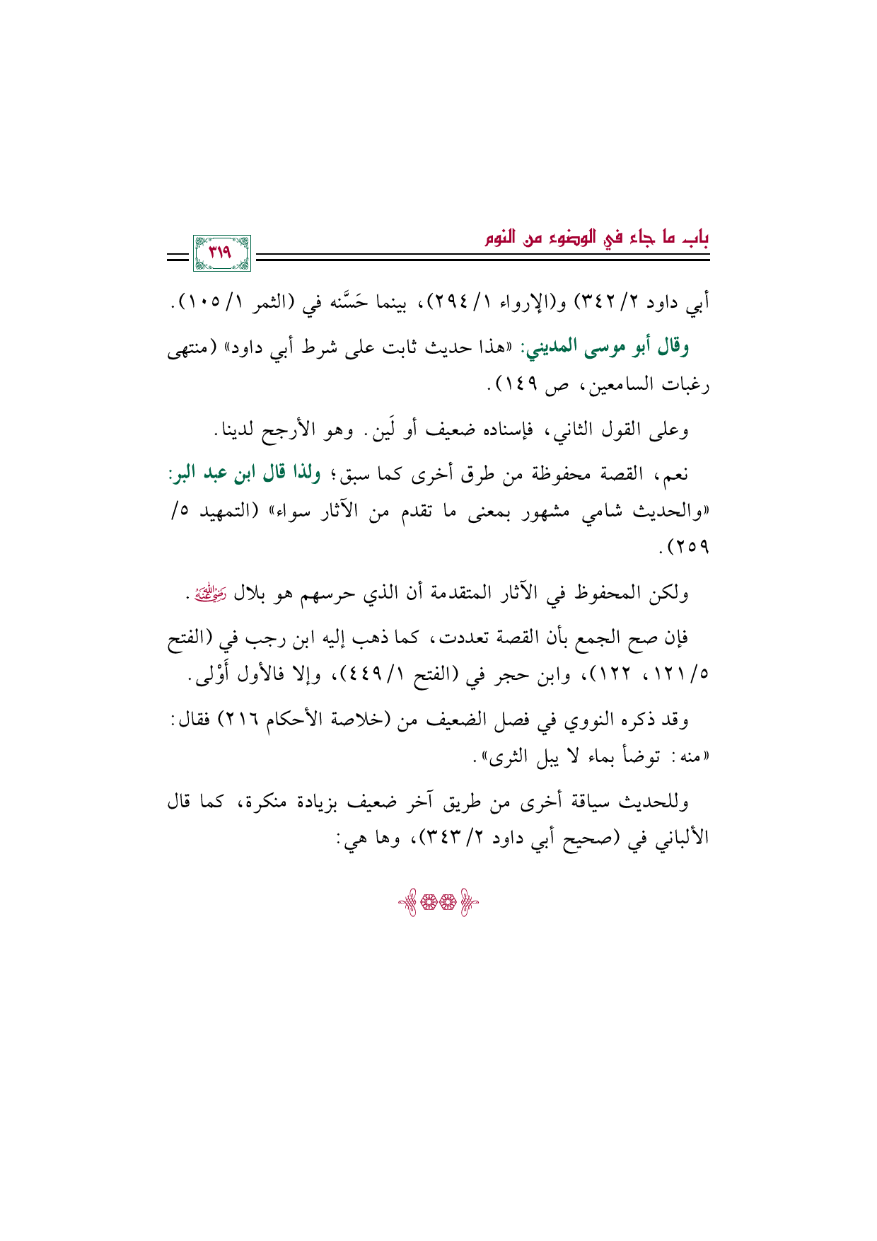 أبي داود ٢/ ٣٤٢) و (الإرواء ١/ ٢٩٤)، بينما حَسَّنه في (الثمر ١/ ١٠٥).