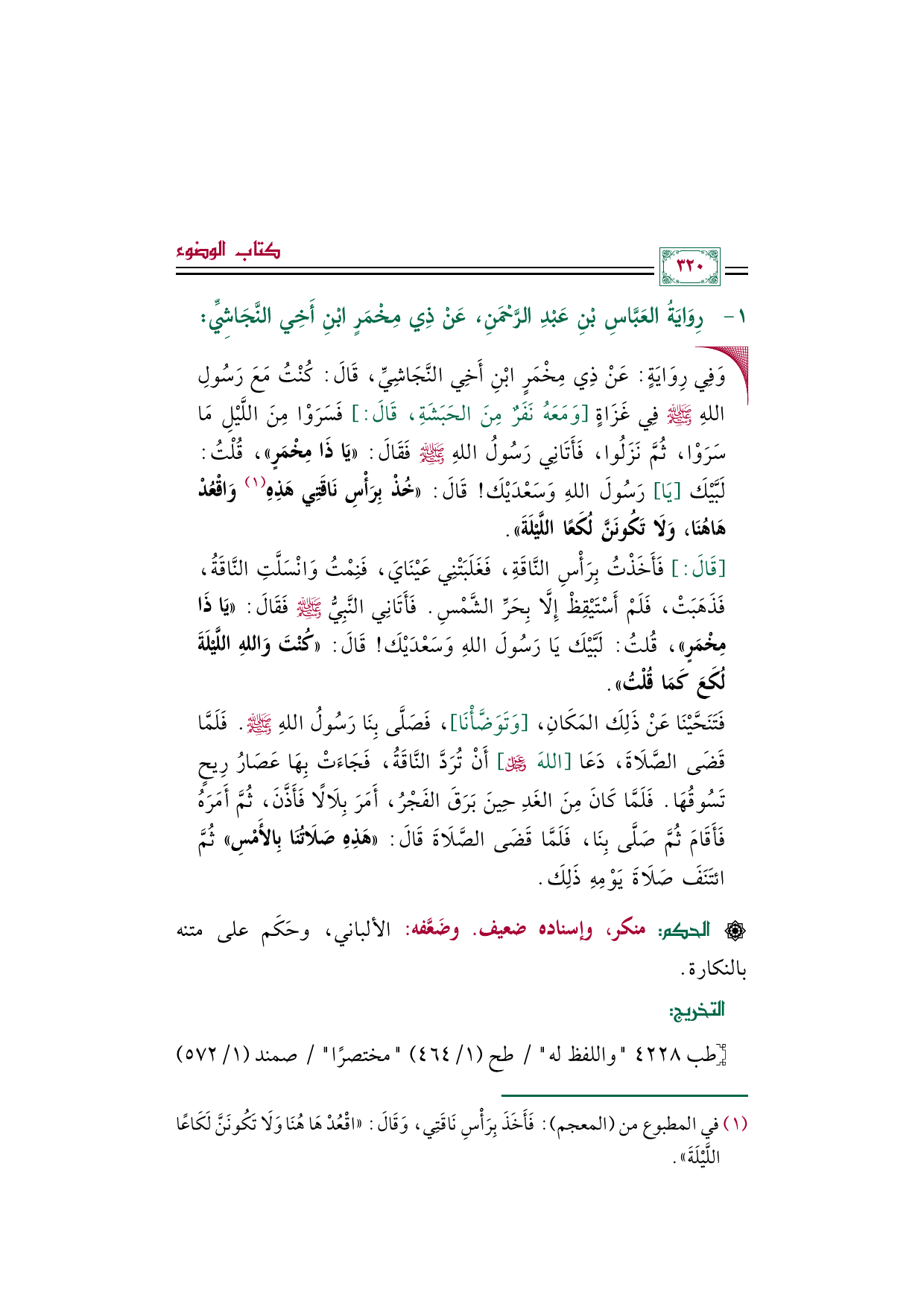 • وَفِي رِوَايَةٍ: عَنْ ذِي مِخْمَرٍ ابْنِ أَخِي النَّجَاشِيِّ، قَالَ: كُنْتُ مَعَ رَسُولِ اللهِ صَلَّى اللهُ عَلَيْهِ وَسَلَّمَ فِي غَزَاةٍ [وَمَعَهُ نَفَرٌ مِنَ الحَبَشَةِ، قَالَ:] فَسَرَوْا مِنَ اللَّيْلِ مَا سَرَوْا، ثُمَّ نَزَلُوا، فَأَتَانِي رَسُولُ اللهِ صَلَّى اللهُ عَلَيْهِ وَسَلَّمَ فَقَالَ: «يَا ذَا مِخْمَرٍ»، قُلْتُ: لَبَّيْكَ [يَا] رَسُولَ اللهِ وَسَعْدَيْكَ! قَالَ: «خُذْ بِرَأْسِ نَاقَتِي هَذِهِ (¬١) وَاقْعُدْ هَاهُنَا، وَلَا تَكُونَنَّ لُكَعًا اللَّيْلَةَ».