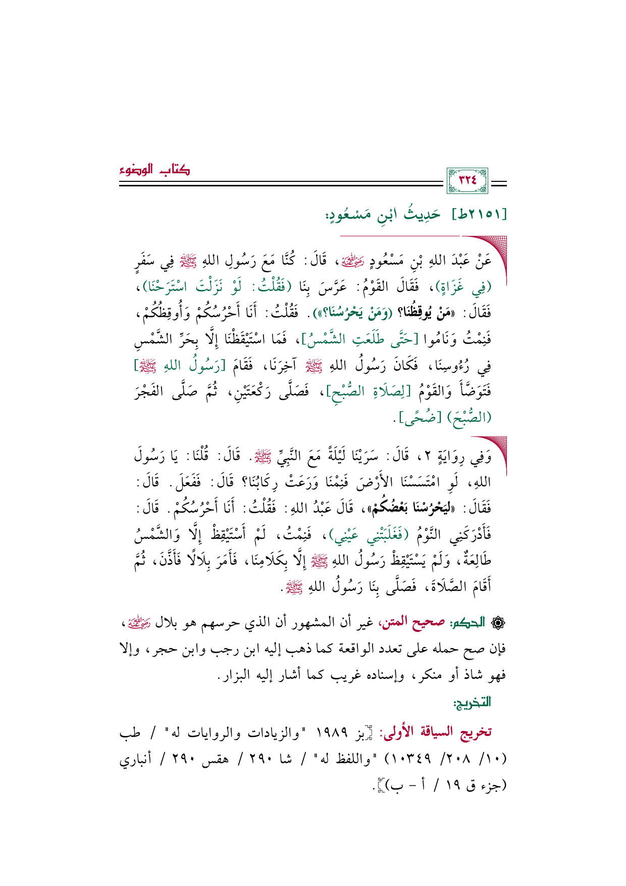 ◼ عَنْ عَبْدَ اللهِ بْنِ مَسْعُودٍ رضي الله عنه، قَالَ: كُنَّا مَعَ رَسُولِ اللهِ صَلَّى اللهُ عَلَيْهِ وَسَلَّمَ فِي سَفَرٍ (فِي غَزَاةٍ)، فَقَالَ القَوْمُ: عَرَّسَ بِنَا (فَقُلْتُ: لَوْ نَزَلْتَ اسْتَرَحْنَا)، فَقَالَ: «مَنْ يُوقِظُنَا؟ (وَمَنْ يَحْرُسُنَا؟ )». فَقُلْتُ: أَنَا أَحْرُسُكُمْ وَأُوقِظُكُمْ، فَنِمْتُ وَنَامُوا [حَتَّى طَلَعَتِ الشَّمْسُ]، فَمَا اسْتَيْقَظْنَا إِلَّا بِحَرِّ الشَّمْسِ فِي رُءُوسِنَا، فَكَانَ رَسُولُ اللهِ صَلَّى اللهُ عَلَيْهِ وَسَلَّمَ آخِرَنَا، فَقَامَ [رَسُولُ اللهِ صَلَّى اللهُ عَلَيْهِ وَسَلَّمَ] فَتَوَضَّأَ وَالقَوْمُ [لِصَلَاةِ الصُّبْحِ]، فَصَلَّى رَكْعَتَيْنِ، ثُمَّ صَلَّى الفَجْرَ (الصُّبْحَ) [ضُحًى].