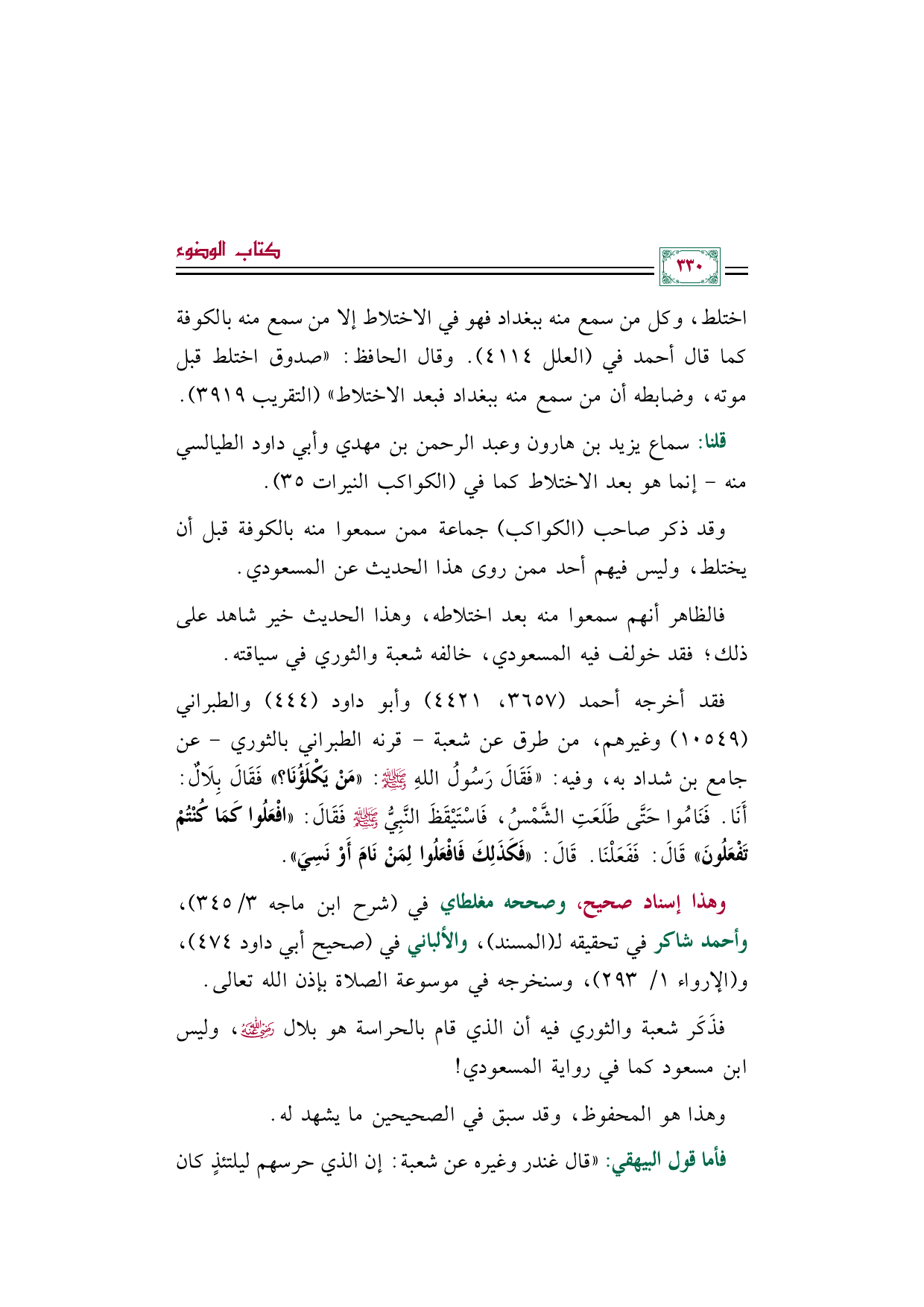 فذَكَر شعبة والثوري فيه أن الذي قام بالحراسة هو بلال رضي الله عنه، وليس ابن مسعود كما في رواية المسعودي!