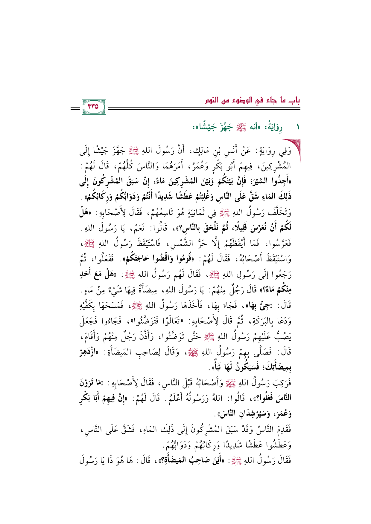 •وَفِي رِوَايَةٍ: عَنْ أَنَسِ بْنِ مَالِكٍ، أَنَّ رَسُولَ اللهِ صَلَّى اللهُ عَلَيْهِ وَسَلَّمَ جَهَّزَ جَيْشًا إِلَى المُشْرِكِينَ، فِيهِمْ أَبُو بَكْرٍ وَعُمَرُ، أَمَرَهُمَا وَالنَّاسَ كُلَّهُمْ، قَالَ لَهُمْ: «أَجِدُّوا السَّيْرَ؛ فَإِنَّ بَيْنَكُمْ وَبَيْنَ المُشْرِكِينَ مَاءً، إِنْ سَبَقَ المُشْرِكُونَ إِلَى ذَلِكَ المَاءِ شَقَّ عَلَى النَّاسِ وَغُلِبْتُمْ عَطَشًا شَدِيدًا أَنْتُمْ وَدَوَابُّكُمْ وَرِكَابُكُمْ». وَتَخَلَّفَ رَسُولُ اللهِ صَلَّى اللهُ عَلَيْهِ وَسَلَّمَ فِي ثَمَانِيَةٍ هُوَ تَاسِعُهُمْ، فَقَالَ لِأَصْحَابِهِ: «هَلْ لَكُمْ أَنْ نُعَرِّسَ قَلِيلًا، ثُمَّ نَلْحَقَ بِالنَّاسِ؟»، قَالُوا: نَعَمْ، يَا رَسُولَ اللهِ. فَعَرَّسُوا، فَمَا أَيْقَظَهُمْ إِلَّا حَرُّ الشَّمْسِ، فَاسْتَيْقَظَ رَسُولُ اللهِ صَلَّى اللهُ عَلَيْهِ وَسَلَّمَ، وَاسْتَيْقَظَ أَصْحَابُهُ، فَقَالَ لَهُمْ: «قُومُوا وَاقْضُوا حَاجَتَكُمْ». فَفَعَلُوا، ثُمَّ رَجَعُوا إلَى رَسُولِ اللهِ صَلَّى اللهُ عَلَيْهِ وَسَلَّمَ، فَقَالَ لَهُم رَسُولُ الله صَلَّى اللهُ عَلَيْهِ وَسَلَّمَ: «هَلْ مَعَ أَحَدٍ مِنْكُمْ مَاءٌ؟» قَالَ رَجُلٌ مِنْهُمْ: يَا رَسُولَ اللهِ، مِيضَأَةٌ فِيهَا شَيْءٌ مِنْ مَاءٍ. قَالَ: «جِئْ بِهَا»، فَجَاءَ بِهَا، فَأَخَذَهَا رَسُولُ اللهِ صَلَّى اللهُ عَلَيْهِ وَسَلَّمَ، فَمَسَحَهَا بِكَفَّيْهِ وَدَعَا بِالبَرَكَةِ، ثُمَّ قَالَ لِأَصْحَابِهِ: «تَعَالَوْا فَتَوَضَّئُوا»، فَجَاءُوا فَجَعَلَ يَصُبُّ عَلَيْهِمْ رَسُولُ اللهِ صَلَّى اللهُ عَلَيْهِ وَسَلَّمَ حَتَّى تَوَضَّئُوا، وَأَذَّنَ رَجُلٌ مِنْهُمْ وَأَقَامَ، قَالَ: فَصَلَّى بِهِمْ رَسُولُ اللهِ صَلَّى اللهُ عَلَيْهِ وَسَلَّمَ، وَقَالَ لِصَاحِبِ المَيضَأَةِ: «ازْدَهِرْ بِمِيضَأَتِكَ؛ فَسَيَكُونُ لَهَا نَبَأٌ».