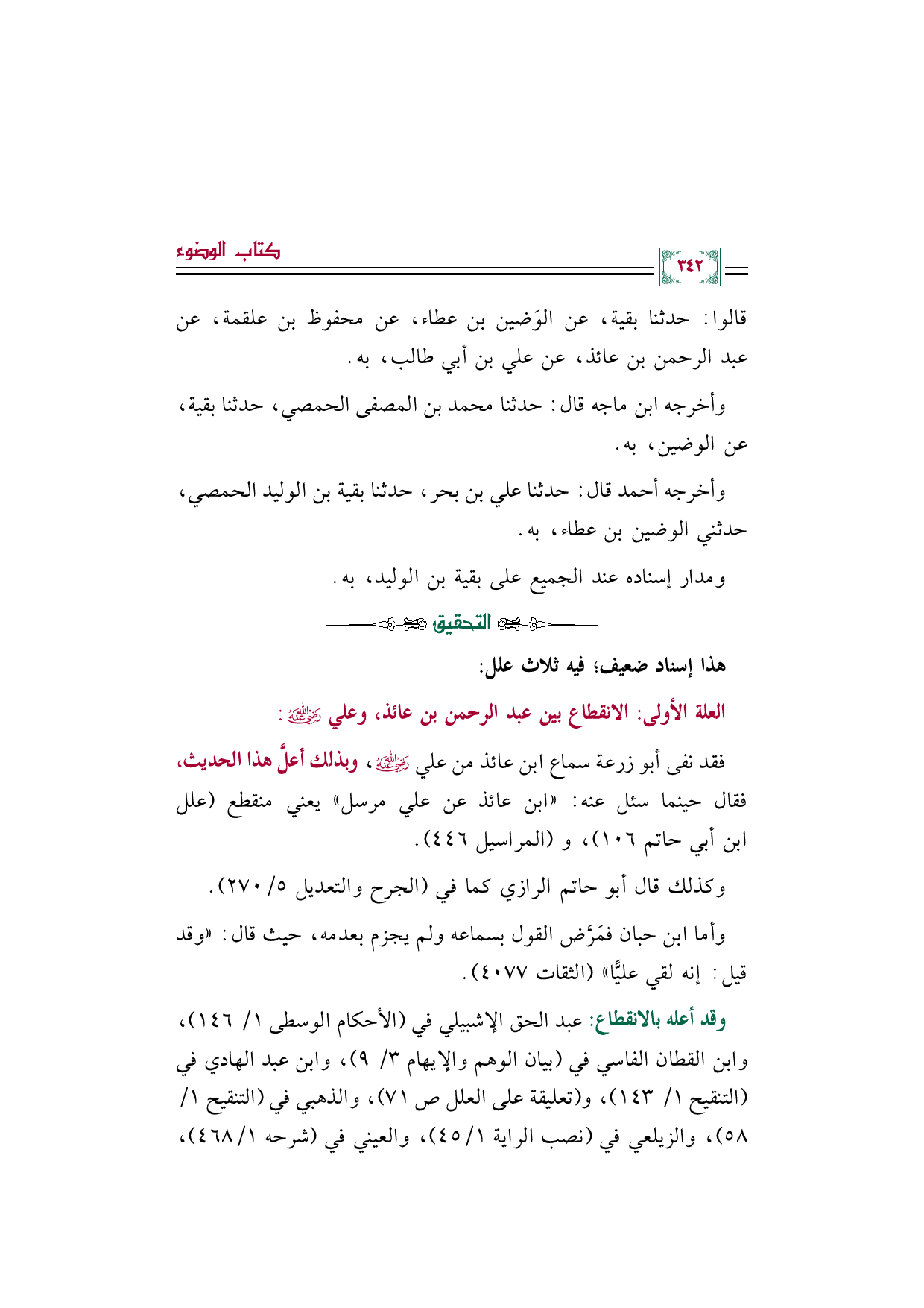 وقد أعله بالانقطاع: عبد الحق الإشبيلي في (الأحكام الوسطى ١/ ١٤٦)، وابن القطان الفاسي في (بيان الوهم والإيهام ٣/ ٩)، وابن عبد الهادي في (التنقيح ١/ ١٤٣)، و (تعليقة على العلل ص ٧١)، والذهبي في (التنقيح ١/ ٥٨)، والزيلعي في (نصب الراية ١/ ٤٥)، والعيني في (شرحه ١/ ٤٦٨)،