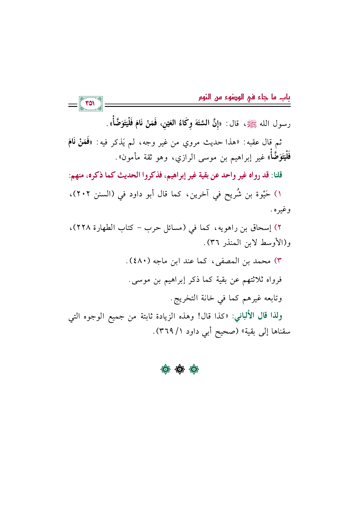 ثم قال عقبه: "هذا حديث مروي من غير وجه، لم يَذكر فيه: «فَمَنْ نَامَ فَلْيَتَوَضَّأْ» غير إبراهيم بن موسى الرازي، وهو ثقة مأمون".