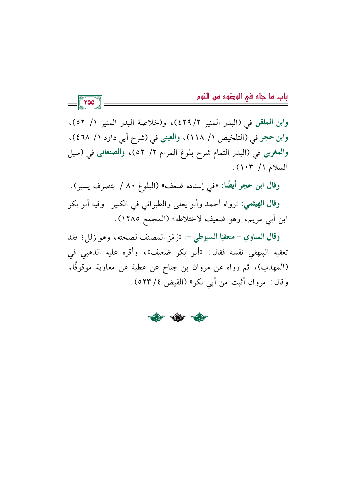 وابن الملقن في (البدر المنير ٢/ ٤٢٩)، و (خلاصة البدر المنير ١/ ٥٢)، وابن حجر في (التلخيص ١/ ١١٨)، والعيني في (شرح أبي داود ١/ ٤٦٨)، والمغربي في (البدر التمام شرح بلوغ المرام ٢/ ٥٢)، والصنعاني في (سبل السلام ١/ ١٠٣).