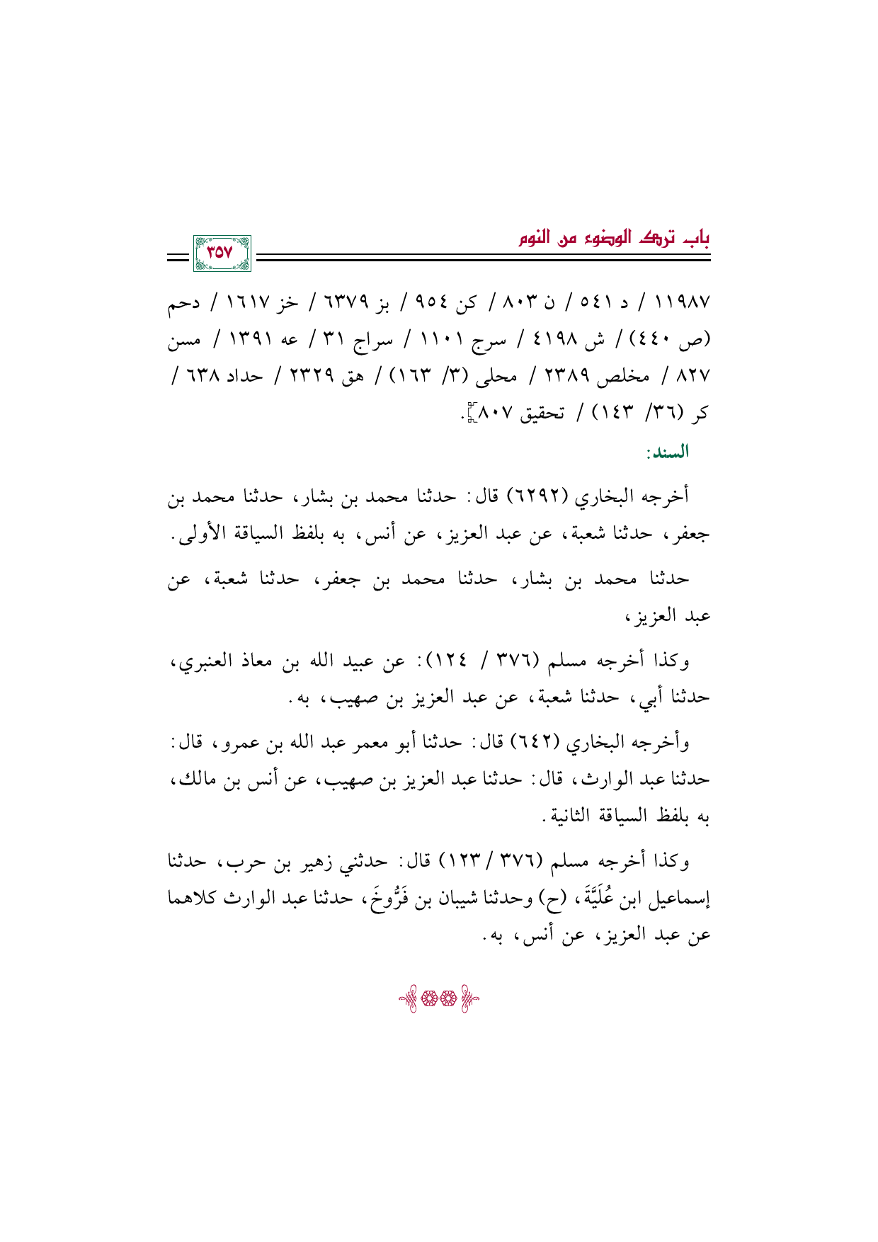 وكذا أخرجه مسلم (٣٧٦/ ١٢٣) قال: حدثني زهير بن حرب، حدثنا إسماعيل ابن عُلَيَّةَ، (ح) وحدثنا شيبان بن فَرُّوخَ، حدثنا عبد الوارث كلاهما عن عبد العزيز، عن أنس، به.