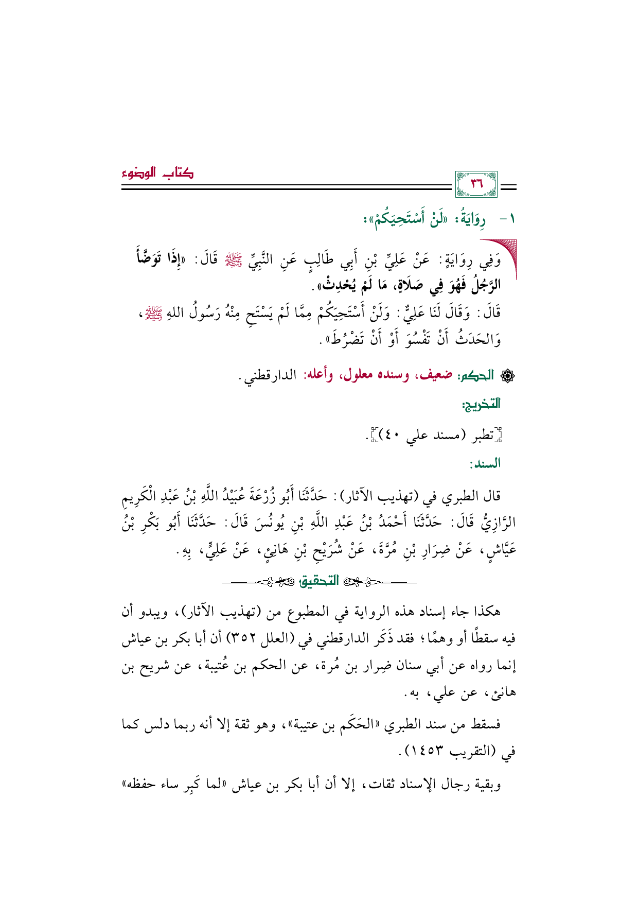 هكذا جاء إسناد هذه الرواية في المطبوع من (تهذيب الآثار)، ويبدو أن فيه سقطًا أو وهمًا؛ فقد ذَكَر الدارقطني في (العلل ٣٥٢) أن أبا بكر بن عياش إنما رواه عن أبي سنان ضِرار بن مُرة، عن الحكم بن عُتيبة، عن شريح بن هانئ، عن علي، به.