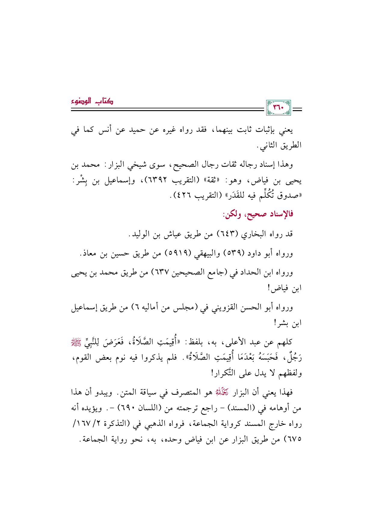 فهذا يعني أن البزار -رحمه الله- هو المتصرف في سياقة المتن. ويبدو أن هذا من أوهامه في (المسند) -راجع ترجمته من (اللسان ٦٩٠) -. ويؤيده أنه رواه خارج المسند كرواية الجماعة، فرواه الذهبي في (التذكرة ٢/ ١٦٧/٦٧٥) من طريق البزار عن ابن فياض وحده، به، نحو رواية الجماعة.