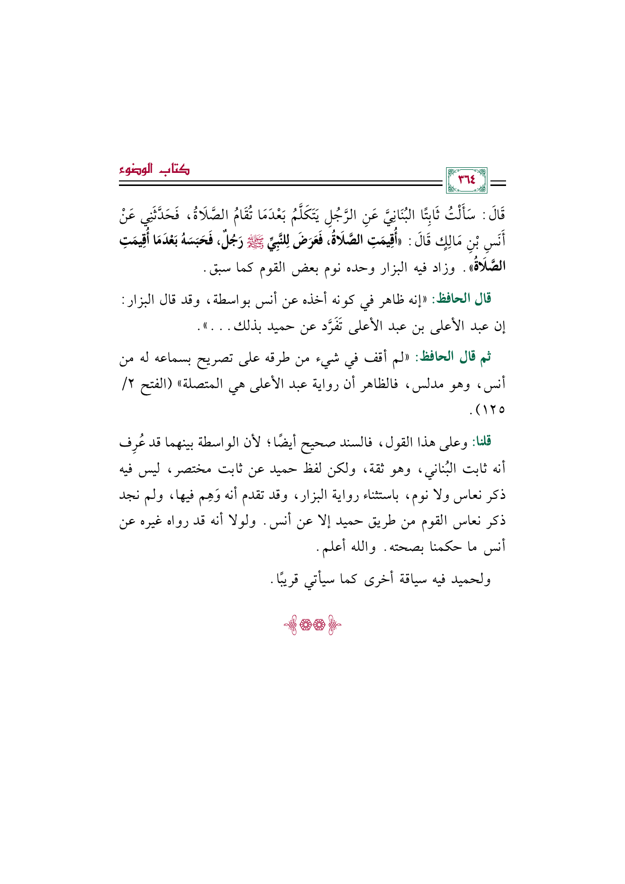 قَالَ: سَأَلْتُ ثَابِتًا البُنَانِيَّ عَنِ الرَّجُلِ يَتَكَلَّمُ بَعْدَمَا تُقَامُ الصَّلَاةُ، فَحَدَّثَنِي عَنْ أَنَسِ بْنِ مَالِكٍ قَالَ: ((أُقِيمَتِ الصَّلَاةُ، فَعَرَضَ لِلنَّبِيِّ صَلَّى اللهُ عَلَيْهِ وَسَلَّمَ رَجُلٌ، فَحَبَسَهُ بَعْدَمَا أُقِيمَتِ الصَّلَاةُ)). وزاد فيه البزار وحده نوم بعض القوم كما سبق.
