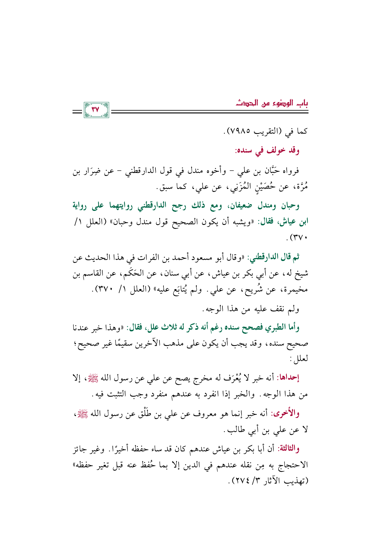 وحبان ومندل ضعيفان، ومع ذلك رجح الدارقطني روايتهما على رواية ابن عياش، فقال: "ويشبه أن يكون الصحيح قول مندل وحبان" (العلل ١/ ٣٧٠).