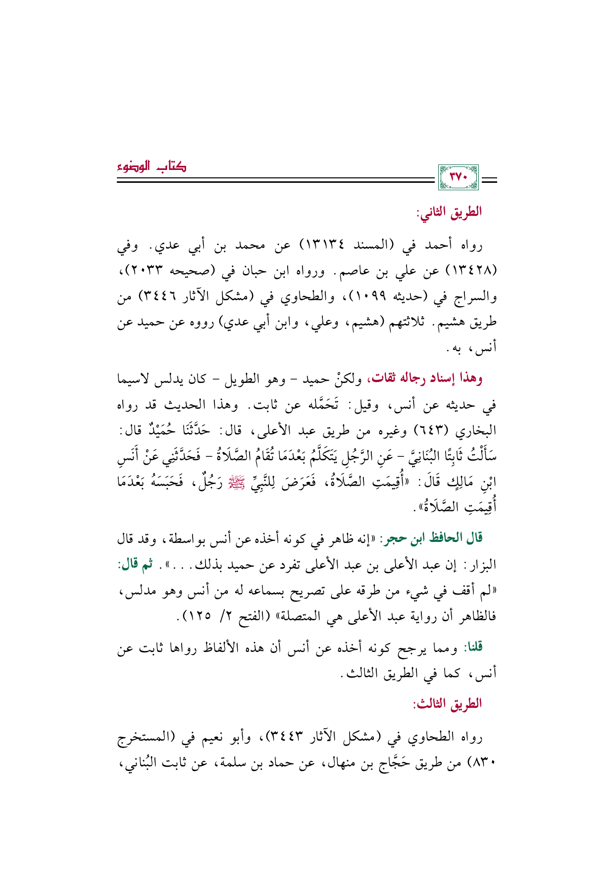 وهذا إسناد رجاله ثقات، ولكنْ حميد -وهو الطويل- كان يدلس لاسيما في حديثه عن أنس، وقيل: تَحَمَّله عن ثابت. وهذا الحديث قد رواه البخاري (٦٤٣) وغيره من طريق عبد الأعلى، قال: حَدَّثَنَا حُمَيْدٌ قال: سَأَلْتُ ثَابِتًا البُنَانِيَّ - عَنِ الرَّجُلِ يَتَكَلَّمُ بَعْدَمَا تُقَامُ الصَّلَاةُ - فَحَدَّثَنِي عَنْ أَنَسِ بْنِ مَالِكٍ قَالَ: «أُقِيمَتِ الصَّلَاةُ، فَعَرَضَ لِلنَّبِيِّ صَلَّى اللهُ عَلَيْهِ وَسَلَّمَ رَجُلٌ، فَحَبَسَهُ بَعْدَمَا أُقِيمَتِ الصَّلَاةُ».