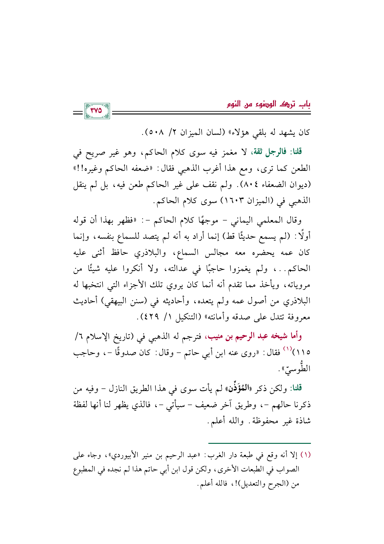 قلنا: فالرجل ثقة، لا مغمز فيه سوى كلام الحاكم، وهو غير صريح في الطعن كما ترى، ومع هذا أغرب الذهبي فقال: "ضعفه الحاكم وغيره! ! " (ديوان الضعفاء ٨٠٤). ولم نقف على غير الحاكم طعن فيه، بل لم ينقل الذهبي في (الميزان ١٦٠٣) سوى كلام الحاكم.