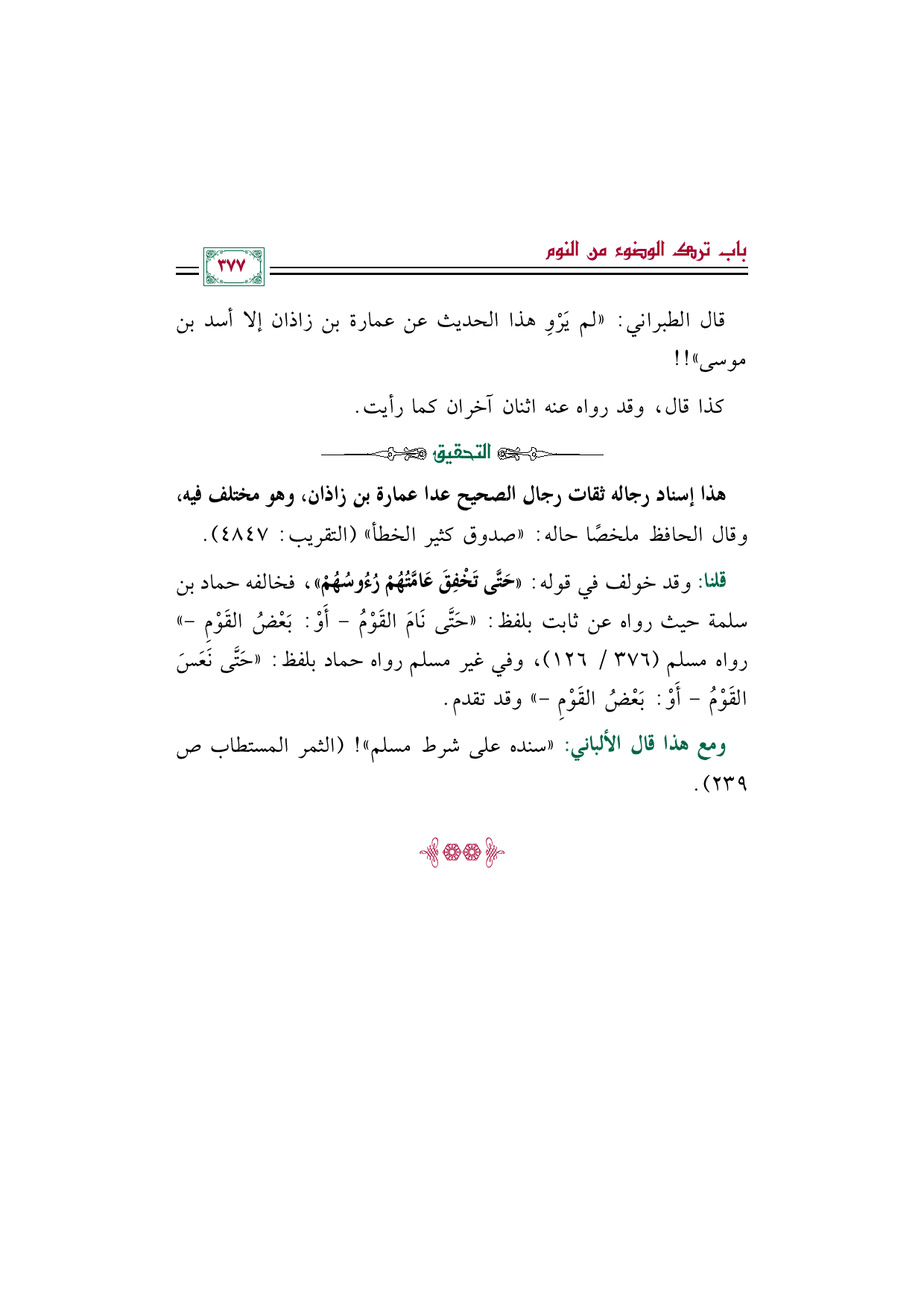 قلنا: وقد خولف في قوله: ((حَتَّى تَخْفِقَ عَامَّتُهُمْ رُءُوسُهُمْ))، فخالفه حماد بن سلمة حيث رواه عن ثابت بلفظ: ((حَتَّى نَامَ القَوْمُ- أَوْ: بَعْضُ القَوْمِ-)) رواه مسلم (٣٧٦/ ١٢٦)، وفي غير مسلم رواه حماد بلفظ: ((حَتَّى نَعَسَ القَوْمُ- أَوْ: بَعْضُ القَوْمِ-)) وقد تقدم.