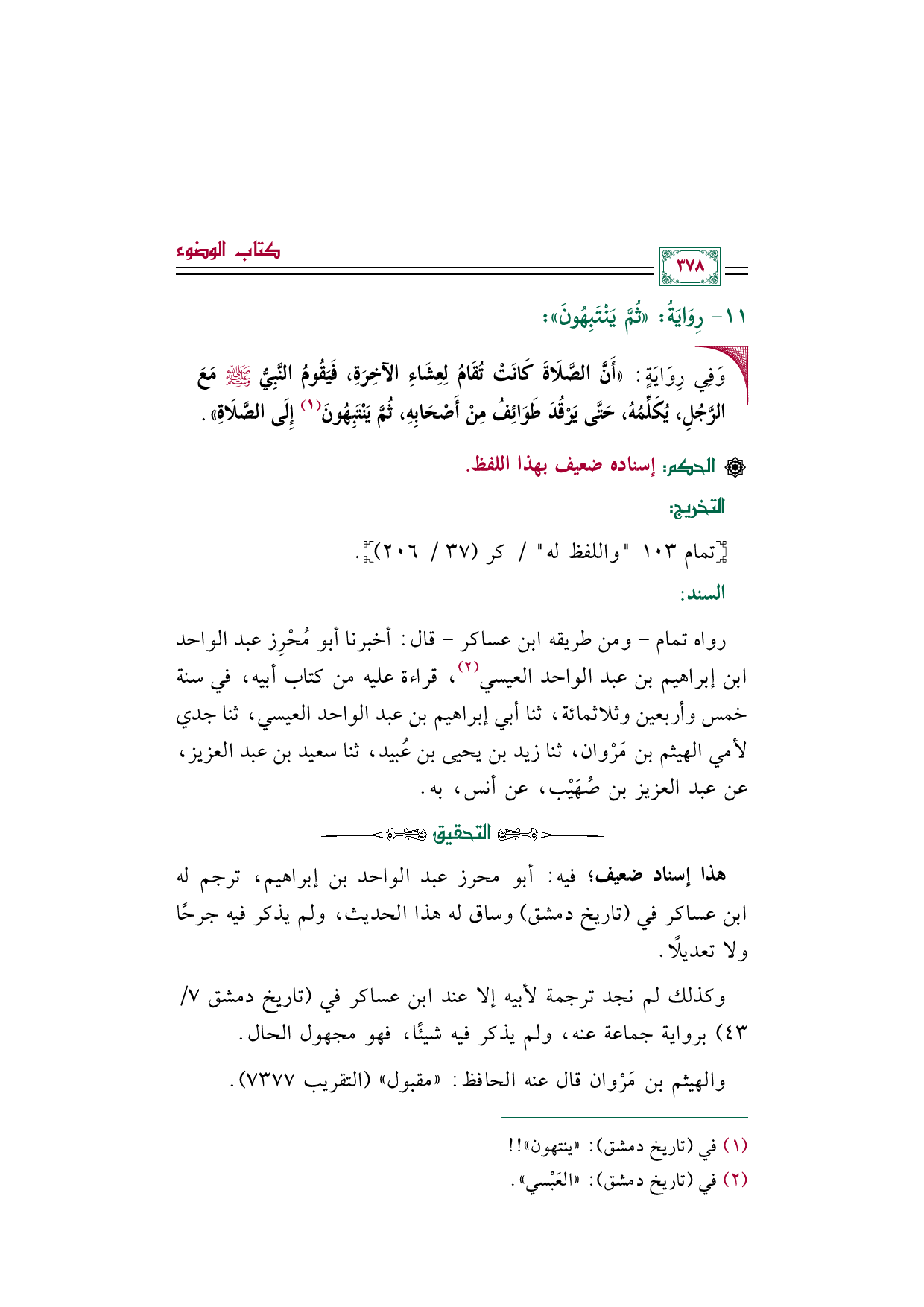 والهيثم بن مَرْوان قال عنه الحافظ: "مقبول" (التقريب ٧٣٧٧).
