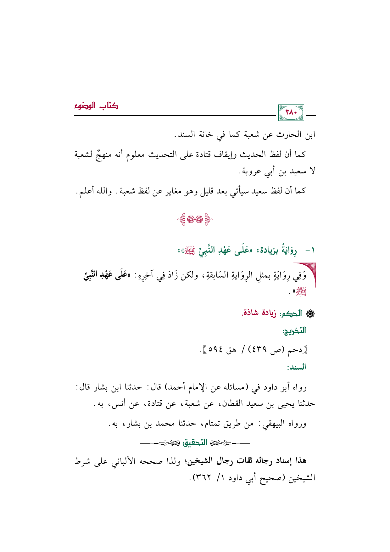 هذا إسناد رجاله ثقات رجال الشيخين؛ ولذا صححه الألباني على شرط الشيخين (صحيح أبي داود ١/ ٣٦٢).