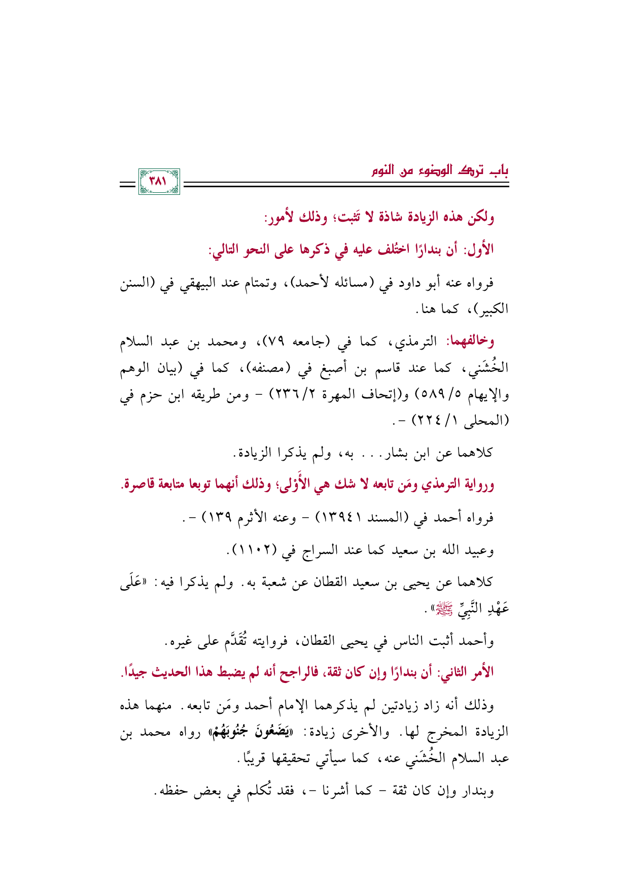 وذلك أنه زاد زيادتين لم يذكرهما الإمام أحمد ومَن تابعه. منهما هذه الزيادة المخرج لها. والأخرى زيادة: ((يَضَعُونَ جُنُوبَهُمْ)) رواه محمد بن عبد السلام الخُشَني عنه، كما سيأتي تحقيقها قريبًا.