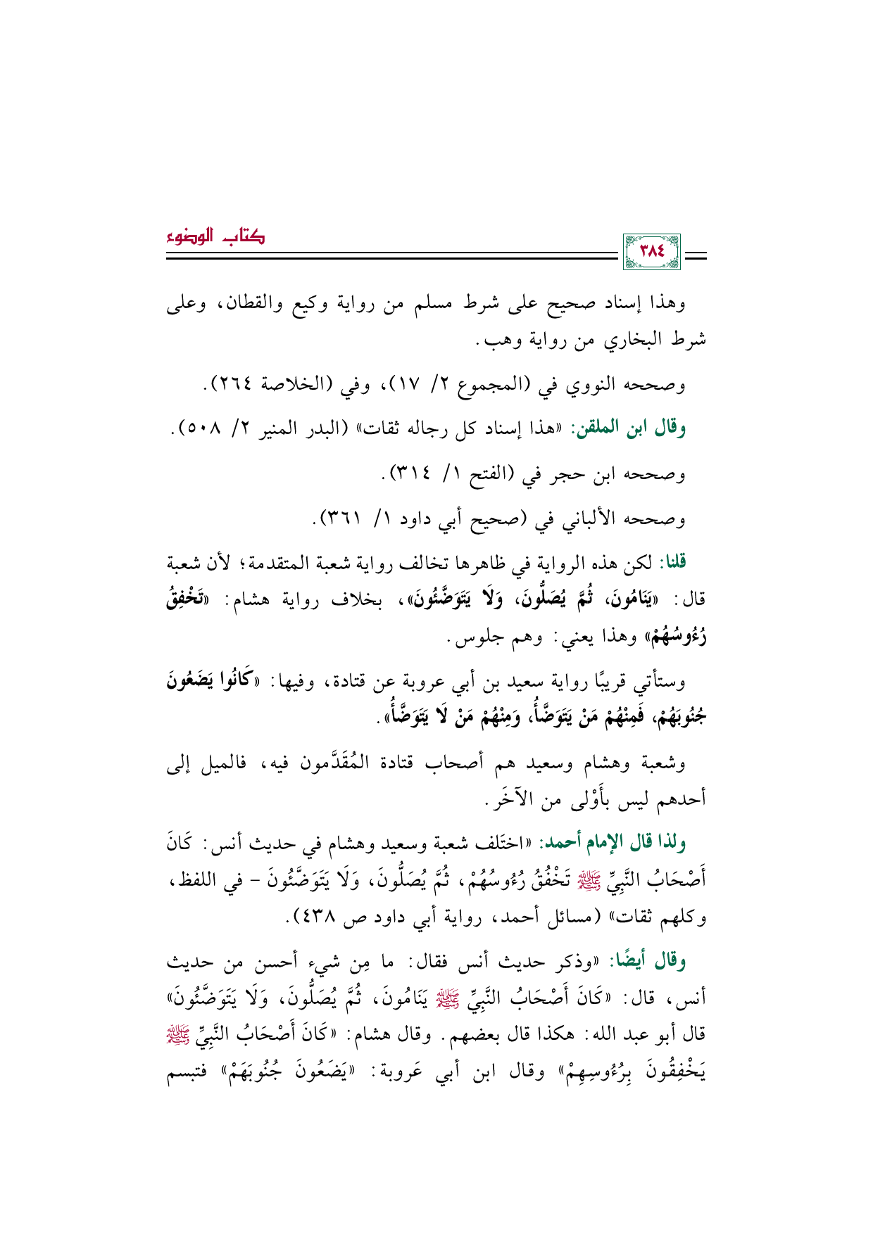 وقال أيضًا: ((وذكر حديث أنس فقال: ما مِن شيء أحسن من حديث أنس، قال: ((كَانَ أَصْحَابُ النَّبِيِّ صَلَّى اللهُ عَلَيْهِ وَسَلَّمَ يَنَامُونَ، ثُمَّ يُصَلُّونَ، وَلَا يَتَوَضَّئُونَ)) قال أبو عبد الله: هكذا قال بعضهم. وقال هشام: ((كَانَ أَصْحَابُ النَّبِيِّ صَلَّى اللهُ عَلَيْهِ وَسَلَّمَ يَخْفِقُونَ بِرُءُوسِهِمْ)) وقال ابن أبي عَروبة: ((يَضَعُونَ جُنُوبَهَمْ)) فتبسم