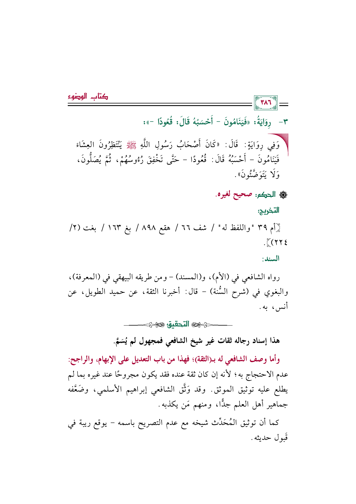 رواه الشافعي في (الأم، والمسند) -ومن طريقه البيهقي في (المعرفة) , والبغوي في (شرح السُّنة) - قال: أخبرنا الثقة، عن حميد الطويل، عن أنس، به.