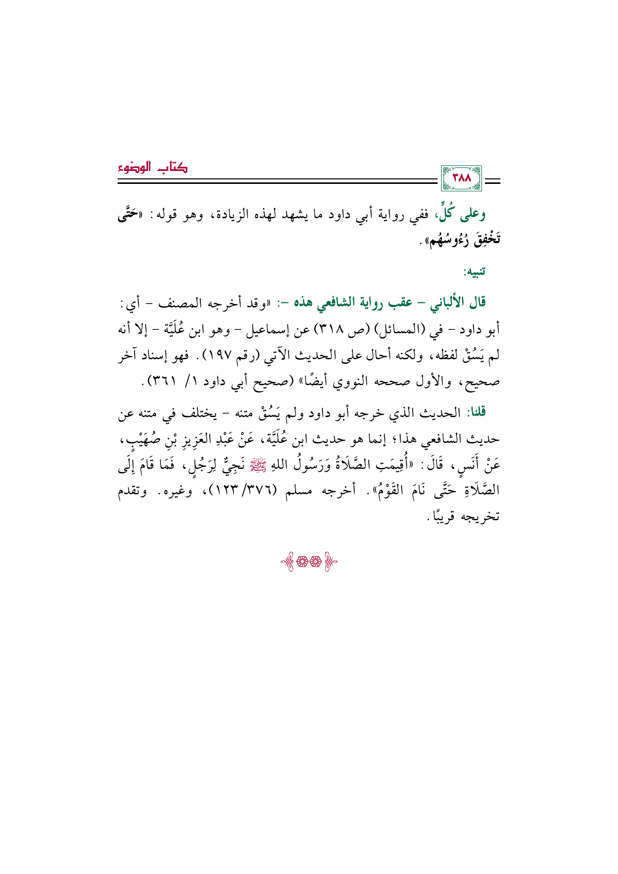قال الألباني - عقب رواية الشافعي هذه-: ((وقد أخرجه المصنف-أي: أبو داود- في "المسائل" (ص ٣١٨) عن إسماعيل- وهو ابن عُلَيَّة- إلا أنه لم يَسُقْ لفظه، ولكنه أحال على الحديث الآتي (رقم ١٩٧). فهو إسناد آخر صحيح، والأول صححه النووي أيضًا)) (صحيح أبي داود ١/ ٣٦١).