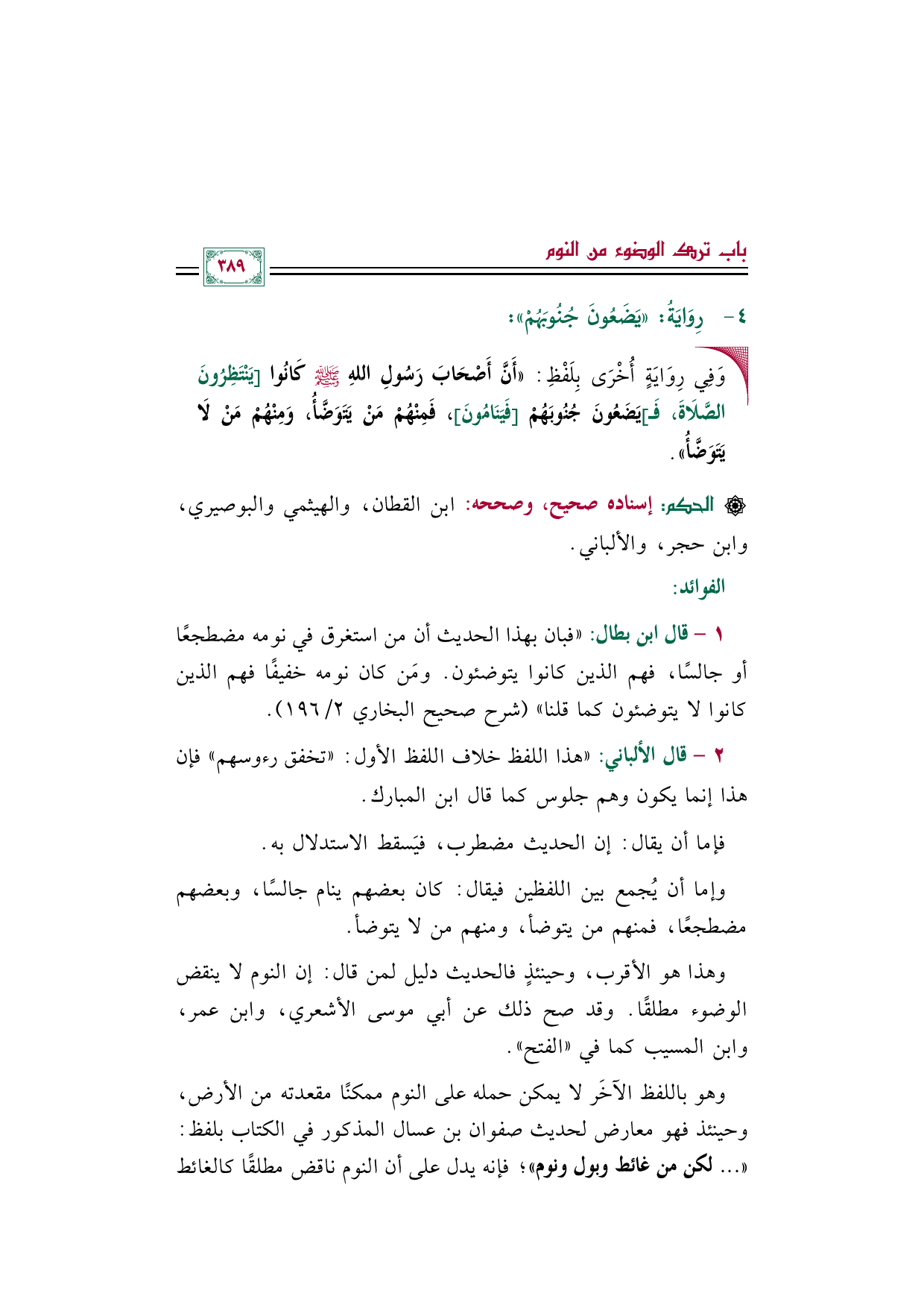 وإما أن يُجمع بين اللفظين فيقال: كان بعضهم ينام جالسًا، وبعضهم مضطجعًا، فمنهم من يتوضأ، ومنهم من لا يتوضأ.
