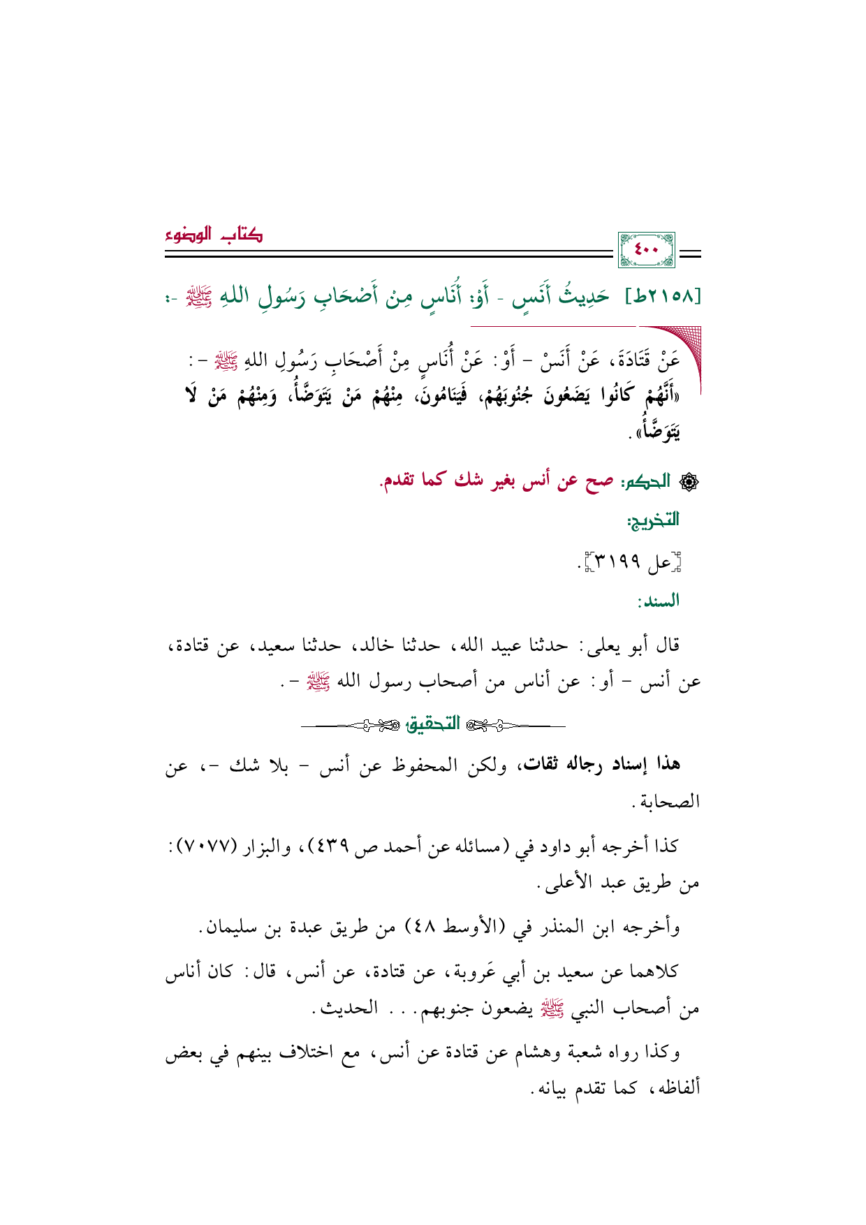 هذا إسناد رجاله ثقات، ولكن المحفوظ عن أنس - بلا شك -، عن الصحابة.