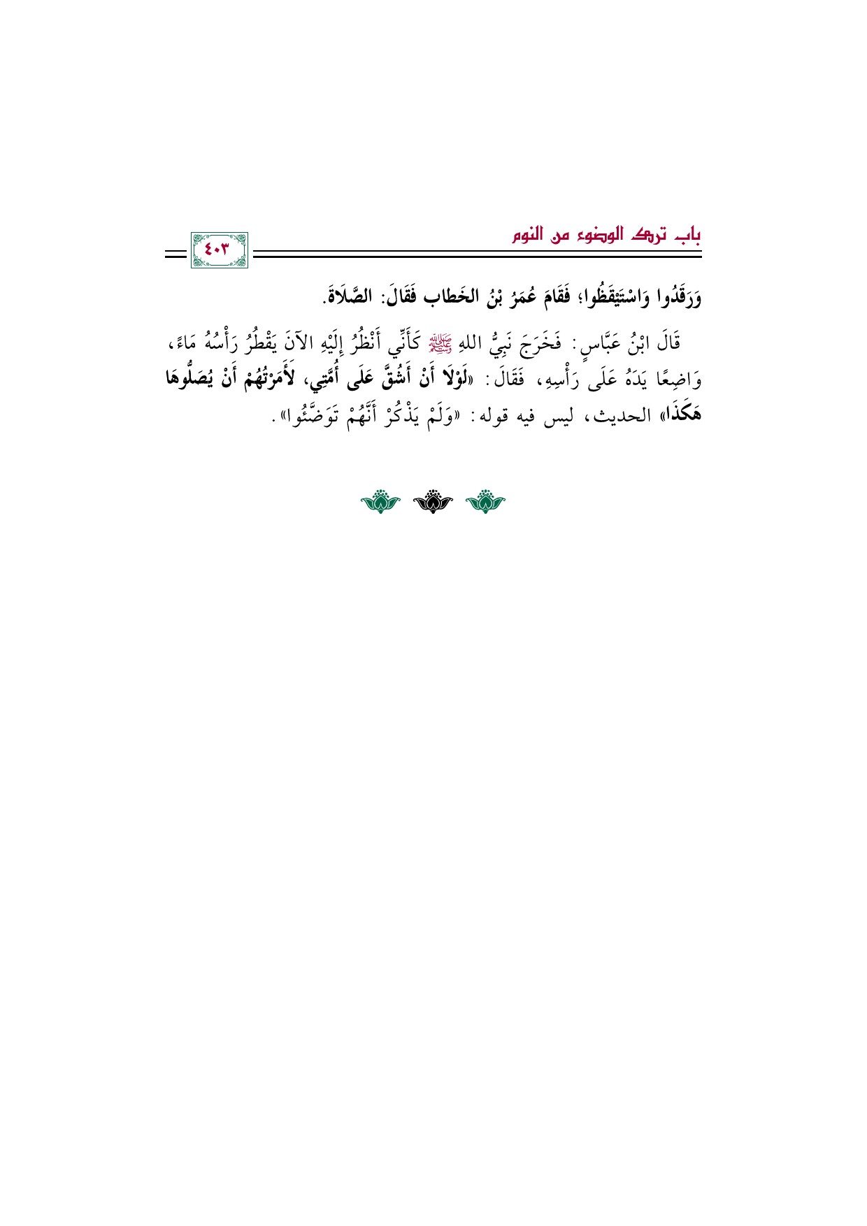 قَالَ ابْنُ عَبَّاسٍ: فَخَرَجَ نَبِيُّ اللهِ صَلَّى اللهُ عَلَيْهِ وَسَلَّمَ كَأَنِّي أَنْظُرُ إِلَيْهِ الآنَ يَقْطُرُ رَأْسُهُ مَاءً، وَاضِعًا يَدَهُ عَلَى رَأْسِهِ، فَقَالَ: "لَوْلَا أَنْ أَشُقَّ عَلَى أُمَّتِي، لَأَمَرْتُهُمْ أَنْ يُصَلُّوهَا هَكَذَا" الحديث، ليس فيه قوله: "وَلَمْ يَذْكُرْ أَنَّهُمْ تَوَضَّئُوا".