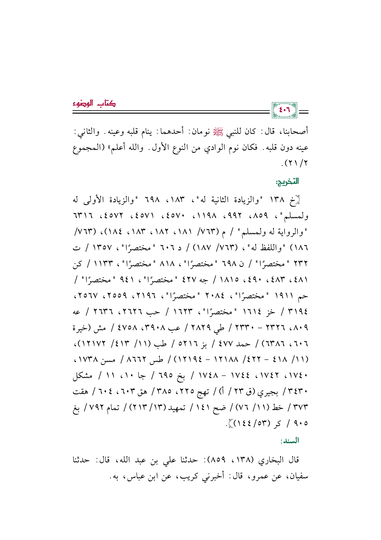 أصحابنا، قال: كان للنبي صلى الله عليه وسلم نومان: أحدهما: ينام قلبه وعينه. والثاني: عينه دون قلبه. فكان نوم الوادي من النوع الأول. والله أعلم" (المجموع ٢/ ٢١).