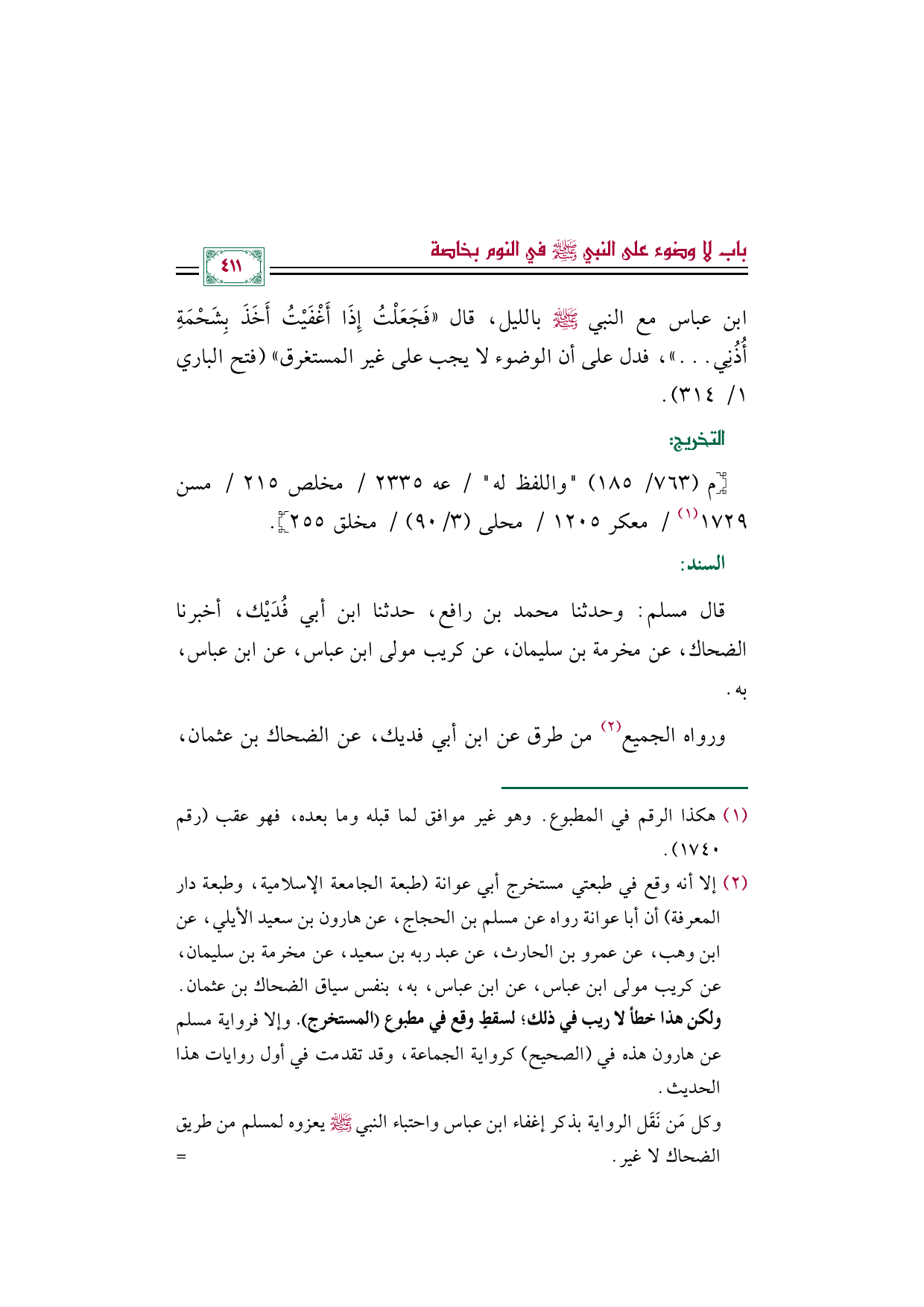 وقد نص على ذلك أبو عوانة نفسه عقب رقم (٢٣٣٤) حيث قال: "رَوَاهُ الضَّحَّاكُ بْنُ عُثْمَانَ، عَنْ مَخْرَمَةَ، وَقَالَ فِيهِ: بِتُّ عِنْدَ خَالَتِي مَيْمُونَةَ، فَقَامَ النَّبِيُّ صَلَّى اللهُ عَلَيهِ وَسَلَّمَ وَقُمْتُ إِلَى جَنْبِهِ الأَيْسَرِ، فَأَخَذَ بِيَدِي فَجَعَلَنِي مِنْ شِقِّهِ الأَيْمَنِ، فَجَعَلْتُ إِذَا أَغْفَيْتُ يَأْخُذُ بِشَحْمَةِ أُذُنِي، فَصَلَّى إِحْدَى عَشْرَةَ رَكْعَةً، ثُمَّ احْتَبَى حَتَّى إِنِّي لأَسْمَعُ نَفَسَهُ رَاقِدًا، فَلَمَّا تَبَيَّنَ لَهُ الْفَجْرُ صَلَّى رَكْعَتَيْنِ خَفِيفَتَيْنِ". ثم ذكر طريق مسلم هذا.
