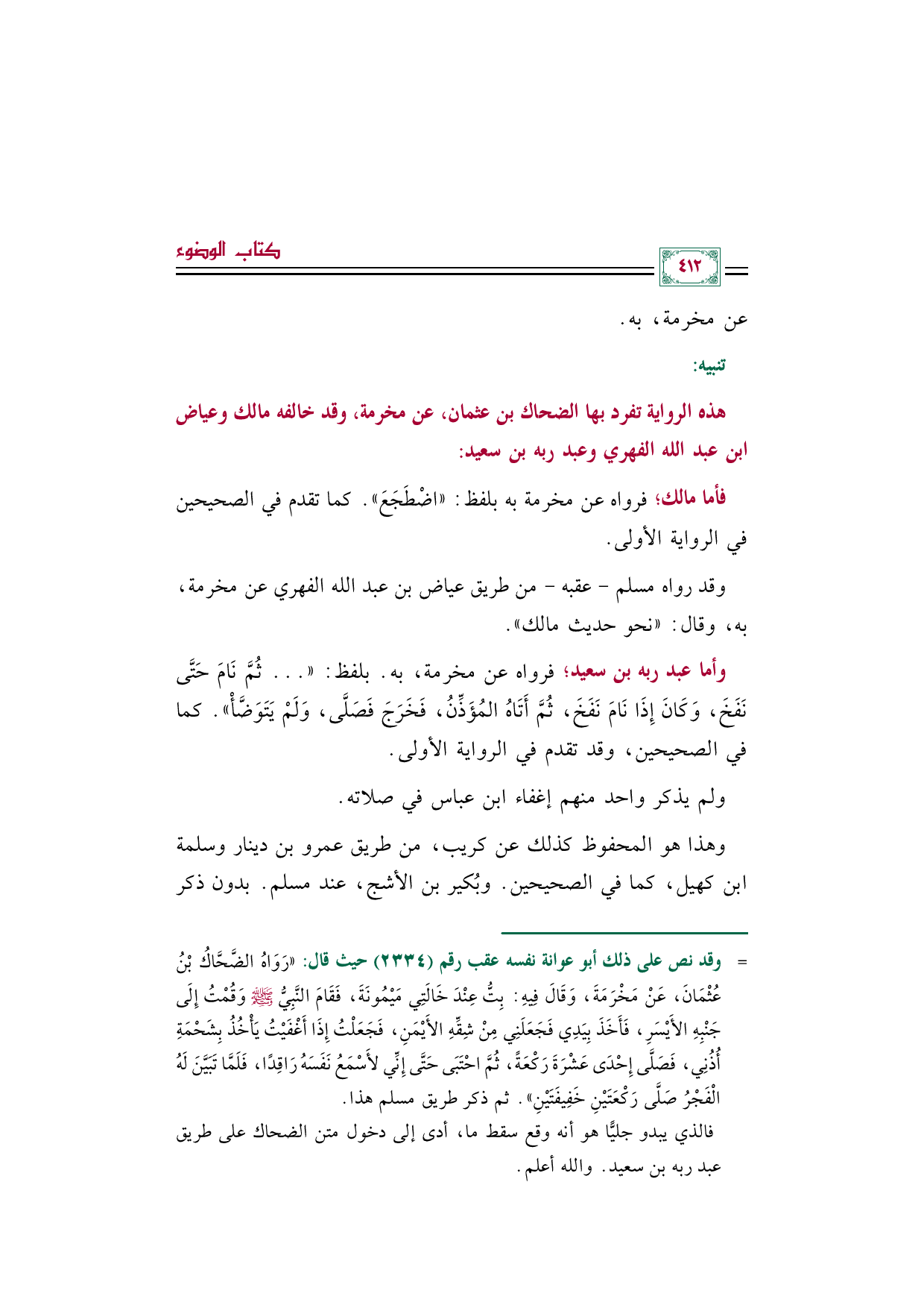 وأما عبد ربه بن سعيد؛ فرواه عن مخرمة، به. بلفظ: (( ... ثُمَّ نَامَ حَتَّى نَفَخَ، وَكَانَ إِذَا نَامَ نَفَخَ، ثُمَّ أَتَاهُ المُؤَذِّنُ، فَخَرَجَ فَصَلَّى، وَلَمْ يَتَوَضَّأْ)). كما في الصحيحين، وقد تقدم في الرواية الأولى.