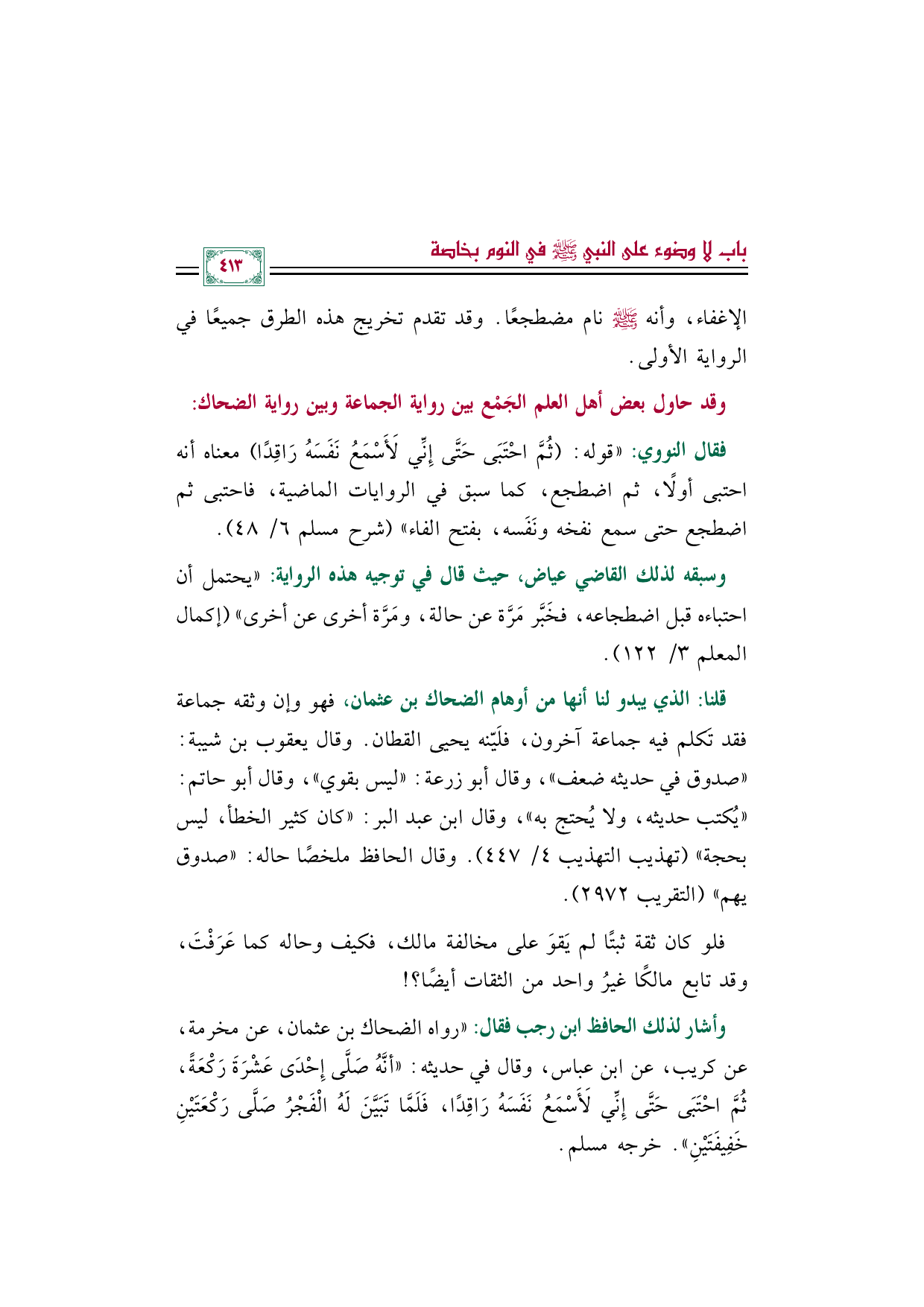 وأشار لذلك الحافظ ابن رجب فقال: "رواه الضحاك بن عثمان، عن مخرمة، عن كريب، عن ابن عباس، وقال في حديثه: ((أنَّهُ صَلَّى إِحْدَى عَشْرَةَ رَكْعَةً، ثُمَّ احْتَبَى حَتَّى إِنِّي لَأَسْمَعُ نَفَسَهُ رَاقِدًا، فَلَمَّا تَبَيَّنَ لَهُ الْفَجْرُ صَلَّى رَكْعَتَيْنِ خَفِيفَتَيْنِ)). خرجه مسلم.