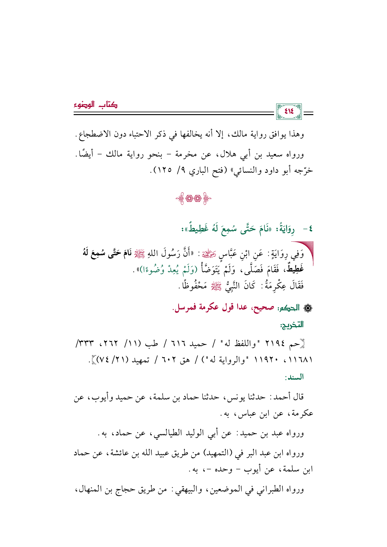• وَفِي رِوَايَةٍ: عَنِ ابْنِ عَبَّاسٍ رضي الله عنه: ((أَنَّ رَسُولَ اللهِ صَلَّى اللهُ عَلَيْهِ وَسَلَّمَ نَامَ حَتَّى سُمِعَ لَهُ غَطِيطٌ، فَقَامَ فَصَلَّى، وَلَمْ يَتَوَضَّأْ (وَلَمْ يُعِدْ وُضُوءًا))).