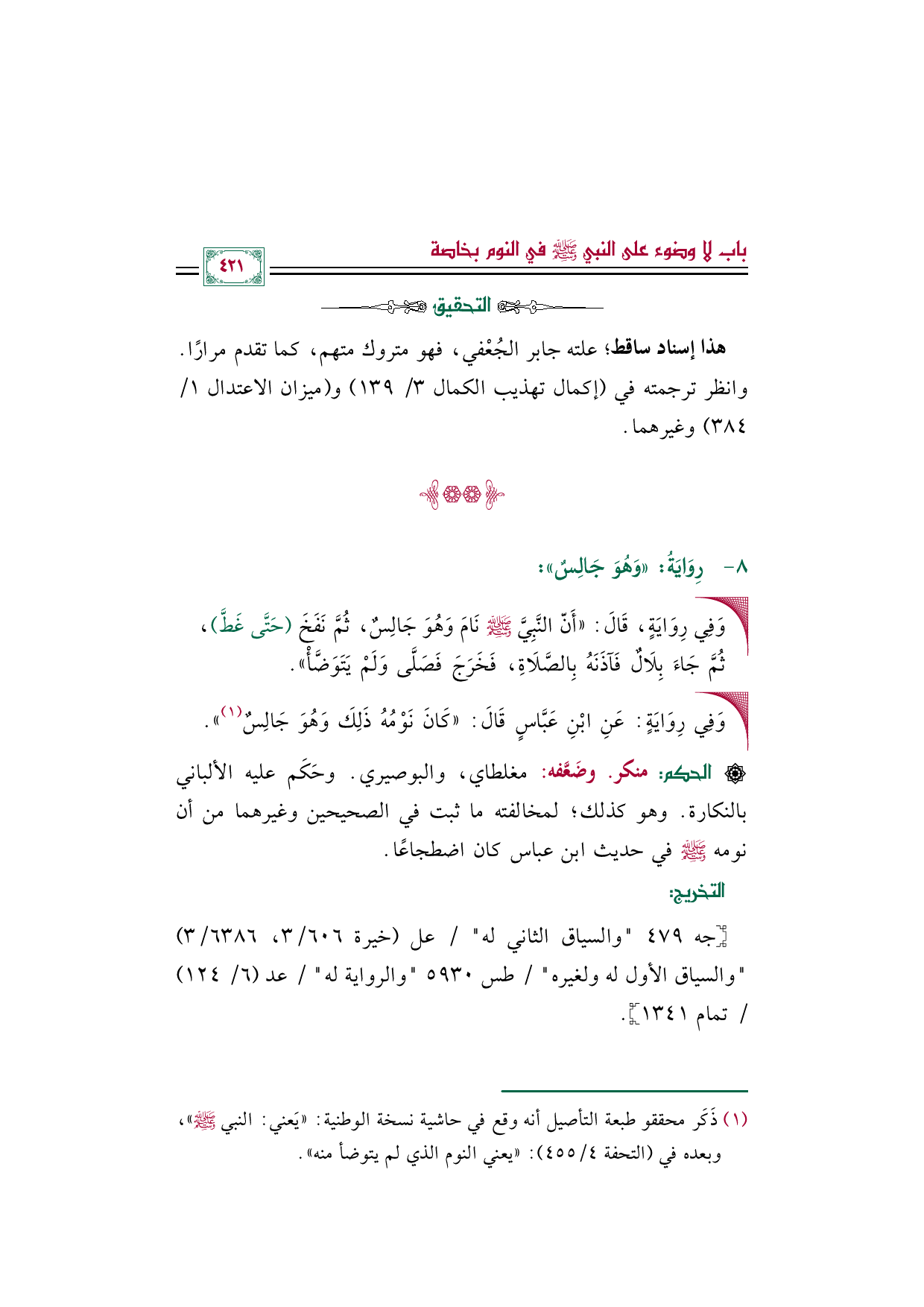 [الحكم]: منكر. وضَعَّفه مغلطاي، والبوصيري. وحَكَم عليه الألباني بالنكارة. وهو كذلك؛ لمخالفته ما ثبت في الصحيحين وغيرهما من أن نومه صلى الله عليه وسلم في حديث ابن عباس كان اضطجاعًا.
