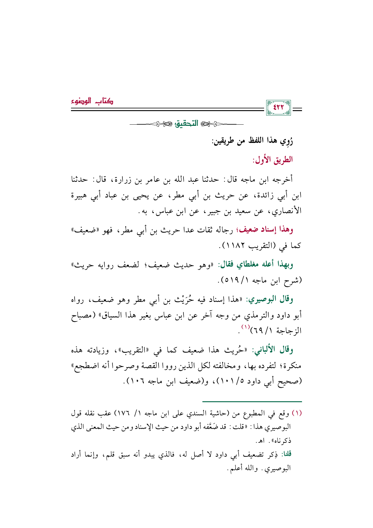 (¬١) وقع في المطبوع من (حاشية السندي على ابن ماجه ١/ ١٧٦) عقب نقله قول البوصيري هذا: "قلت: قد ضَعَّفه أبو داود من حيث الإسناد ومن حيث المعنى الذي ذكرناه" اهـ.