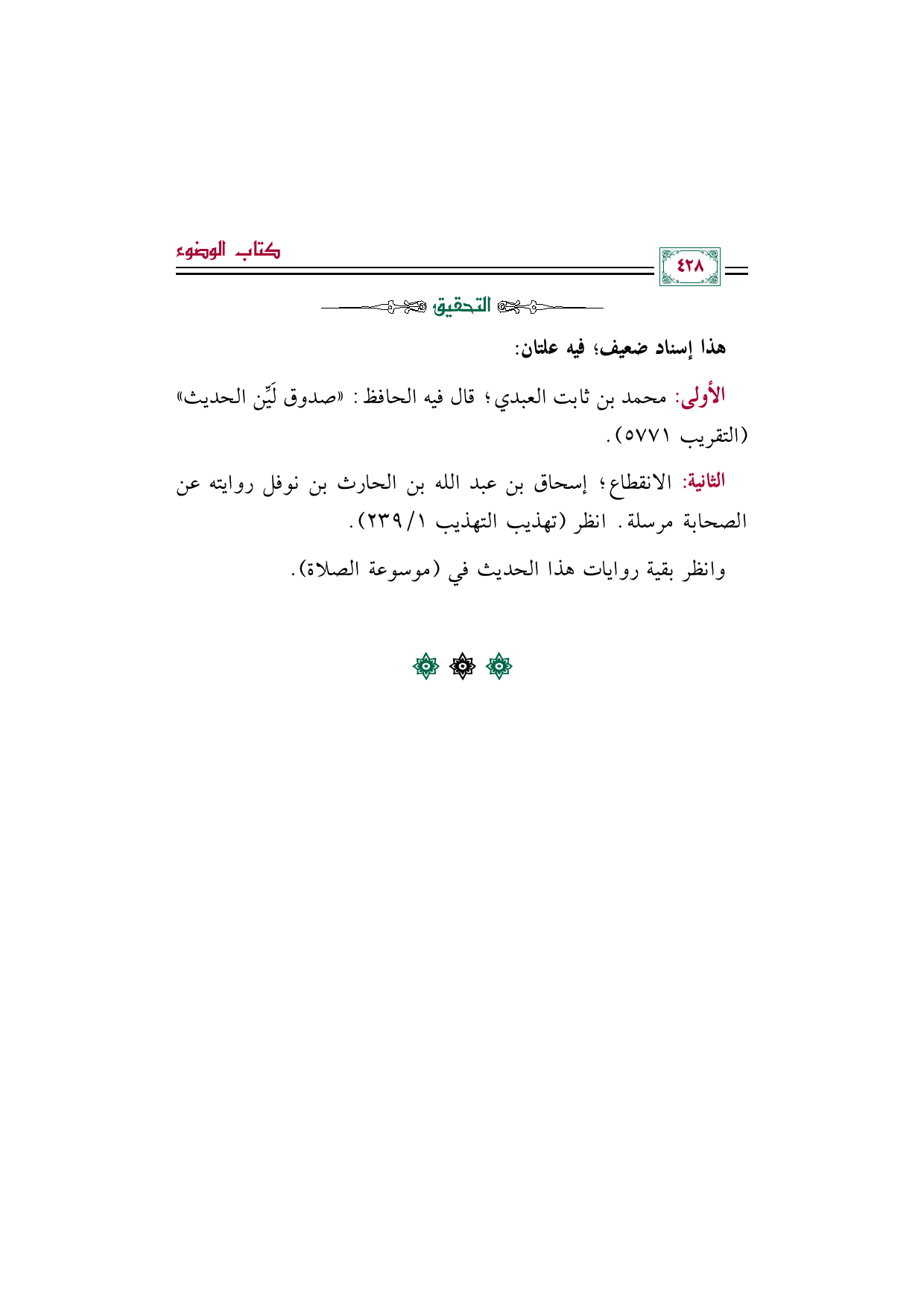الأولى: محمد بن ثابت العبدي؛ قال فيه الحافظ: "صدوق لَيِّن الحديث" (التقريب ٥٧٧١).