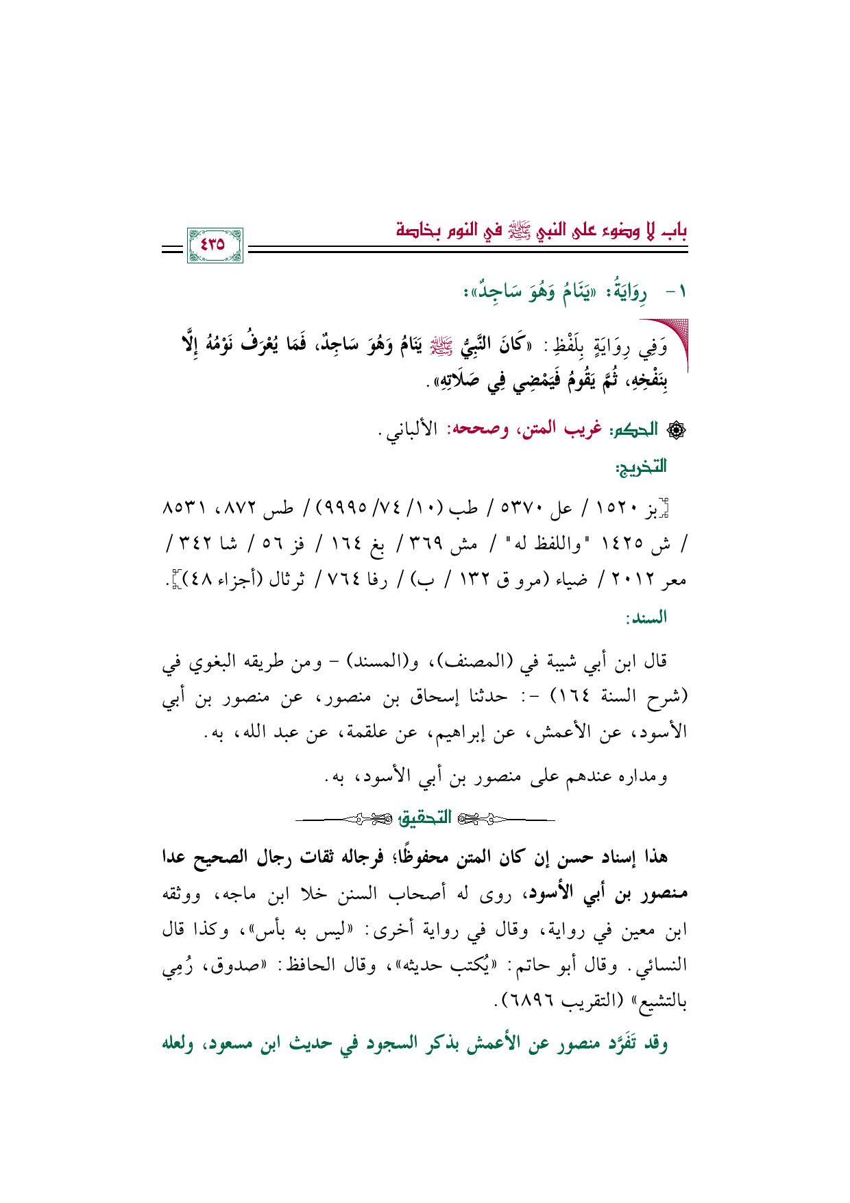 قال ابن أبي شيبة في (المصنف)، و (المسند) -ومن طريقه البغوي في (شرح السنة ١٦٤) -: حدثنا إسحاق بن منصور، عن منصور بن أبي الأسود، عن الأعمش، عن إبراهيم، عن علقمة، عن عبد الله، به.