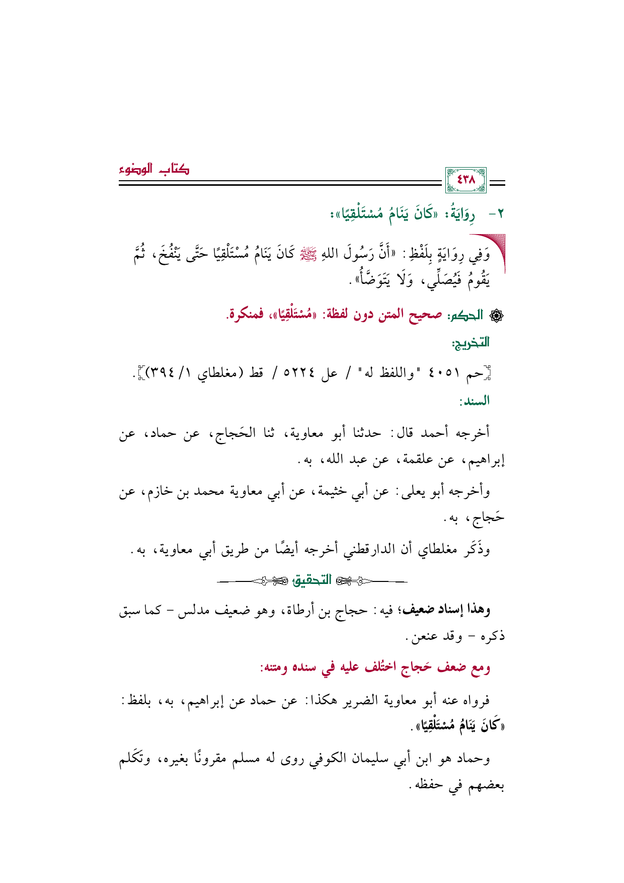 * فرواه عنه أبو معاوية الضرير هكذا: عن حماد عن إبراهيم، به، بلفظ: ((كَانَ يَنَامُ مُسْتَلْقِيًا)).