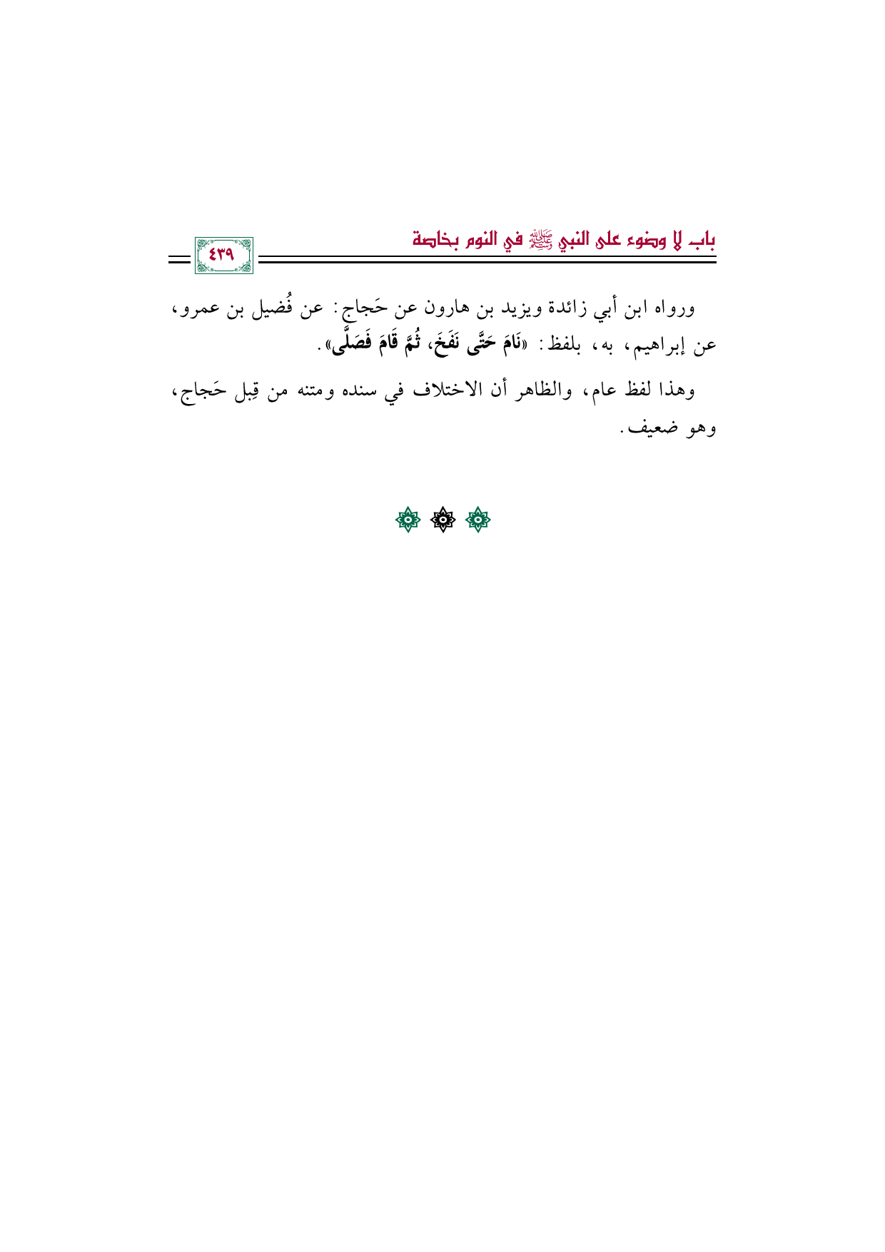 * ورواه ابن أبي زائدة ويزيد بن هارون عن حَجاج: عن فُضيل بن عمرو، عن إبراهيم، به، بلفظ: ((نَامَ حَتَّى نَفَخَ، ثُمَّ قَامَ فَصَلَّى)).
