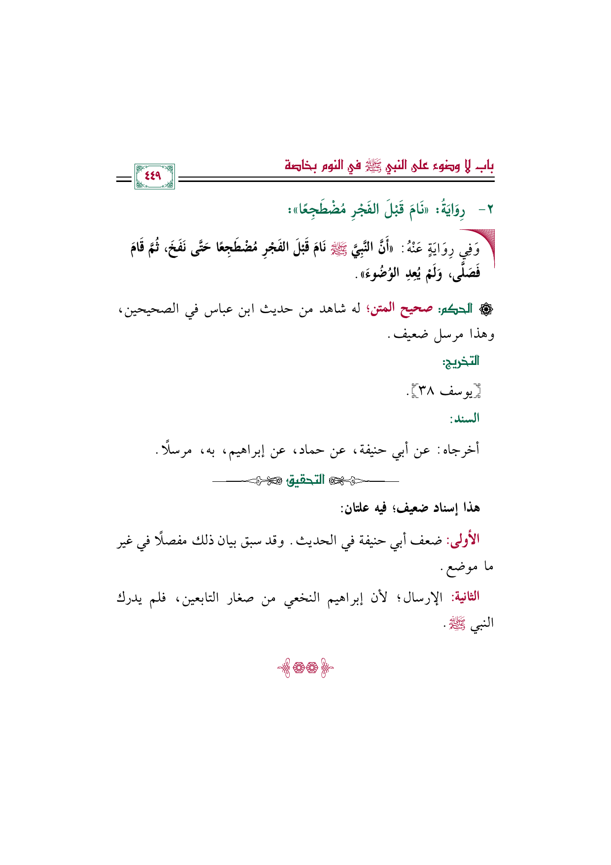 الثانية: الإرسال؛ لأن إبراهيم النخعي من صغار التابعين، فلم يدرك النبي صلى الله عليه وسلم.