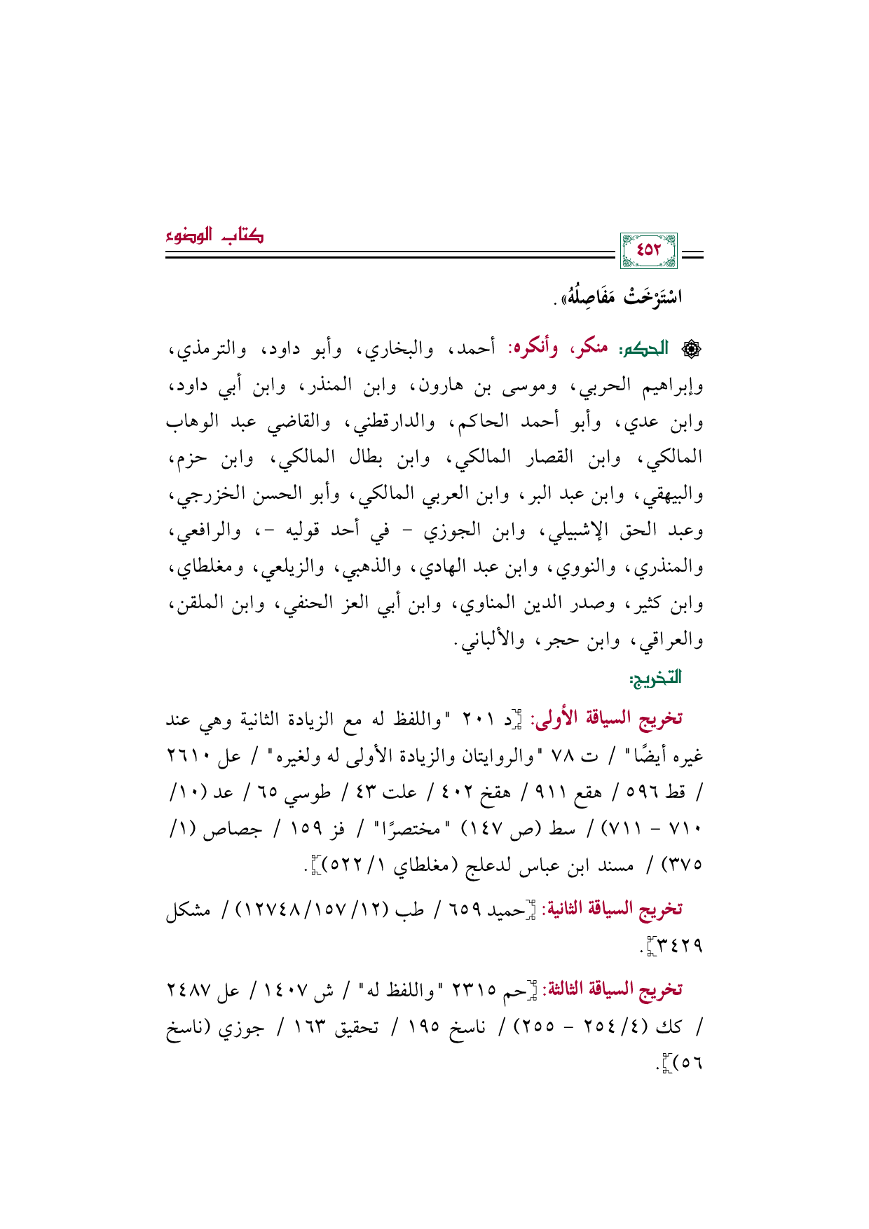 تخريج السياقة الأولى: [د ٢٠١ "واللفظ له مع الزيادة الثانية وهي عند غيره أيضًا" / ت ٧٨ "والروايتان والزيادة الأولى له ولغيره" / عل ٢٦١٠ / قط ٥٩٦/ هقع ٩١١ / هقخ ٤٠٢ / علت ٤٣ / طوسي ٦٥ / عد (١٠/ ٧١٠ - ٧١١) / سط (ص ١٤٧) مختصرًا / فز ١٥٩ / جصاص (١/ ٣٧٥) / مسند ابن عباس لدعلج (مغلطاي ١/ ٥٢٢)].