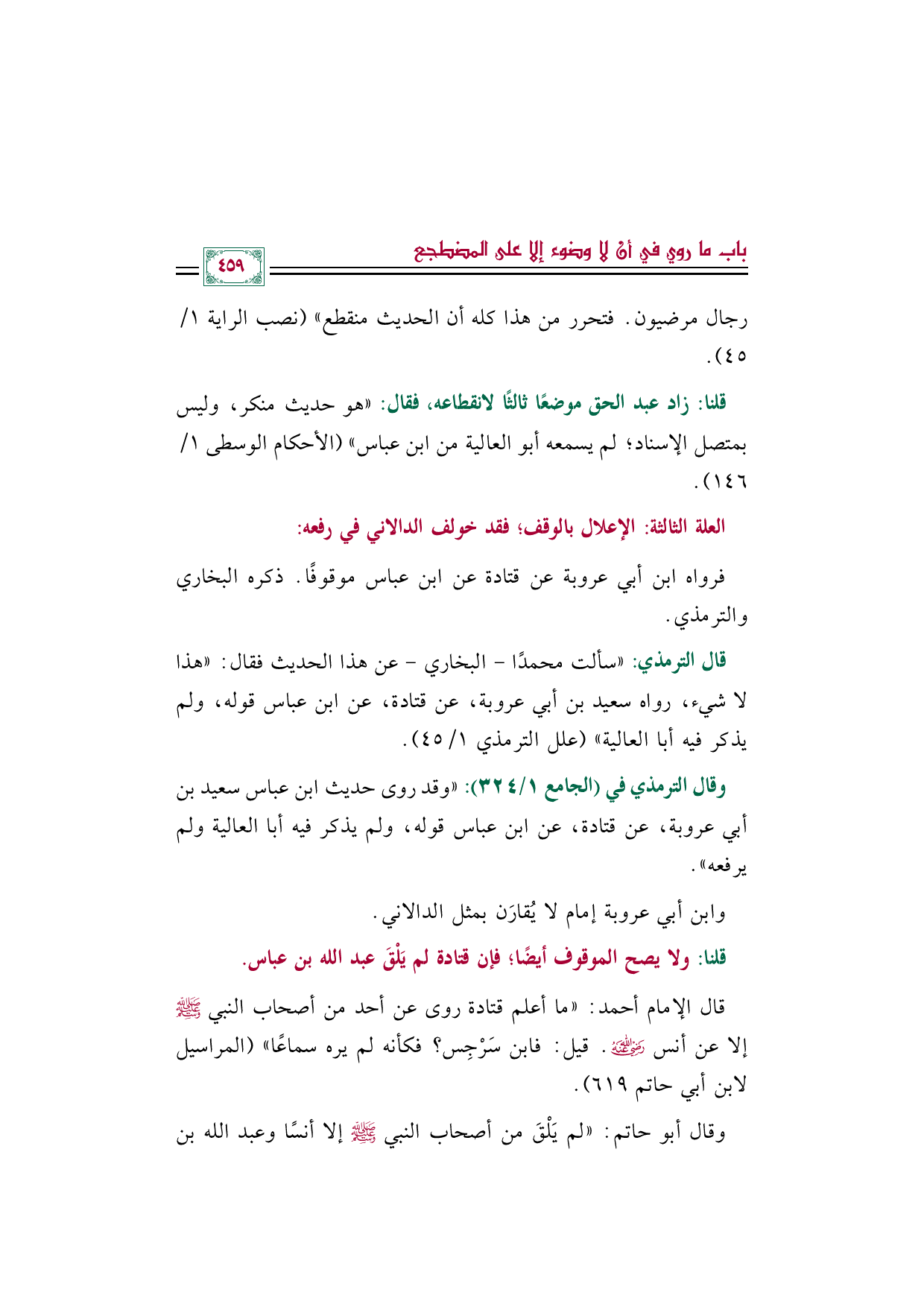 وقال الترمذي في (الجامع ١/ ٣٢٤): "وقد روى حديث ابن عباس سعيد بن أبي عروبة، عن قتادة، عن ابن عباس قوله، ولم يذكر فيه أبا العالية ولم يرفعه".