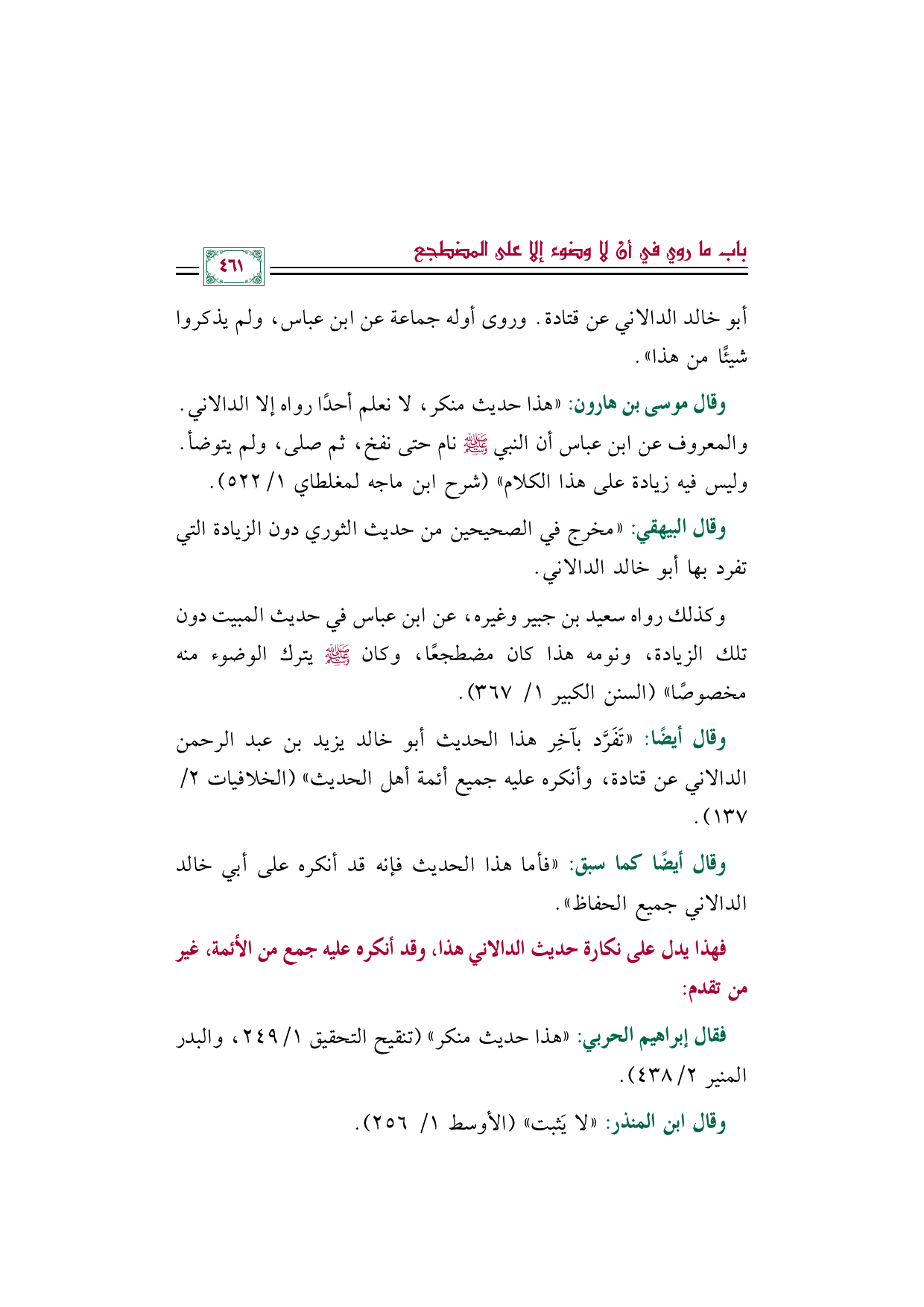 وقال موسى بن هارون: ((هذا حديث منكر، لا نعلم أحدًا رواه إلا الدالاني. والمعروف عن ابن عباس أن النبي صلى الله عليه وسلم نام حتى نفخ، ثم صلى، ولم يتوضأ. وليس فيه زيادة على هذا الكلام)) (شرح ابن ماجه لمغلطاي ١/ ٥٢٢).