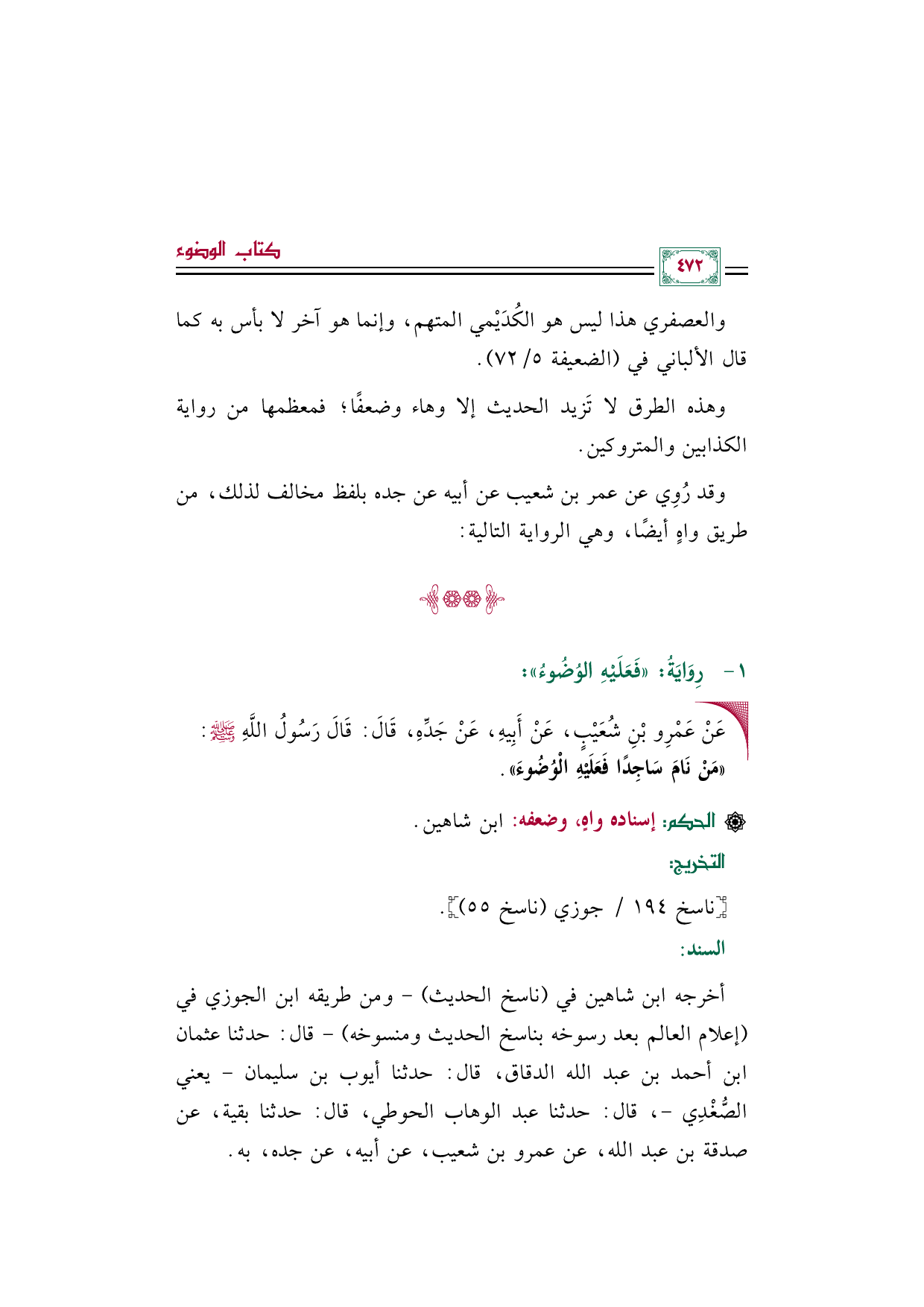 • عَنْ عَمْرِو بْنِ شُعَيْبٍ، عَنْ أَبِيهِ، عَنْ جَدِّهِ، قَالَ: قَالَ رَسُولُ اللَّهِ صلى الله عليه وسلم: «مَنْ نَامَ سَاجِدًا فَعَلَيْهِ الْوُضُوءَ».