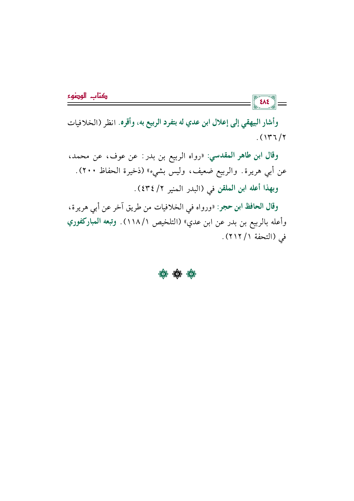 وقال الحافظ ابن حجر: "ورواه في الخلافيات من طريق آخر عن أبي هريرة، وأعله بالربيع بن بدر عن ابن عدي" (التلخيص ١/ ١١٨). وتبعه المباركفوري في (التحفة ١/ ٢١٢).