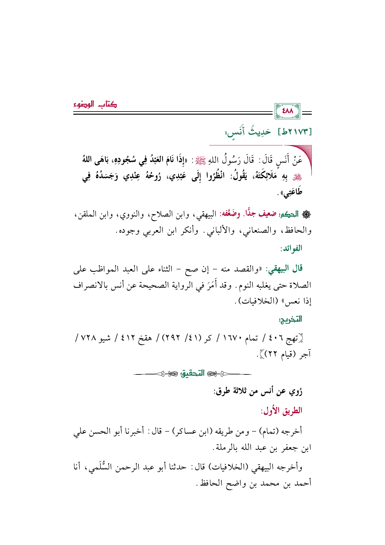 [الحكم]: ضعيف جدًّا. وضَعَّفه: البيهقي، وابن الصلاح، والنووي، وابن الملقن، والحافظ، والصنعاني، والألباني. وأنكر ابن العربي وجوده.