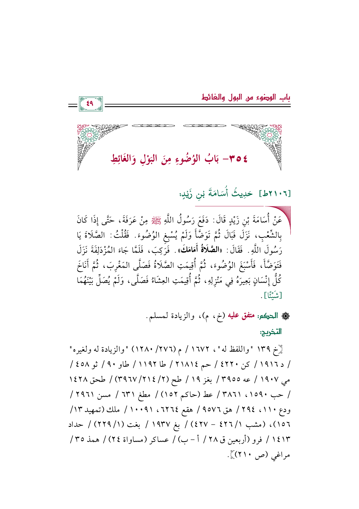 ◼ عَنْ أُسَامَةَ بْنِ زَيْدٍ قَالَ: دَفَعَ رَسُولُ اللَّهِ صَلَّى اللهُ عَلَيْهِ وَسَلَّمَ مِنْ عَرَفَةَ، حَتَّى إِذَا كَانَ بِالشِّعْبِ، نَزَلَ فَبَالَ ثُمَّ تَوَضَّأَ وَلَمْ يُسْبِغِ الوُضُوءَ. فَقُلْتُ: الصَّلَاةَ يَا رَسُولَ اللَّهِ. فَقَالَ: «الصَّلَاةُ أَمَامَكَ». فَرَكِبَ، فَلَمَّا جَاءَ المُزْدَلِفَةَ نَزَلَ فَتَوَضَّأَ، فَأَسْبَغَ الوُضُوءَ، ثُمَّ أُقِيمَتِ الصَّلَاةُ فَصَلَّى المَغْرِبَ، ثُمَّ أَنَاخَ كُلُّ إِنْسَانٍ بَعِيرَهُ فِي مَنْزِلِهِ، ثُمَّ أُقِيمَتِ العِشَاءُ فَصَلَّى، وَلَمْ يُصَلِّ بَيْنَهُمَا [شَيْئًا].