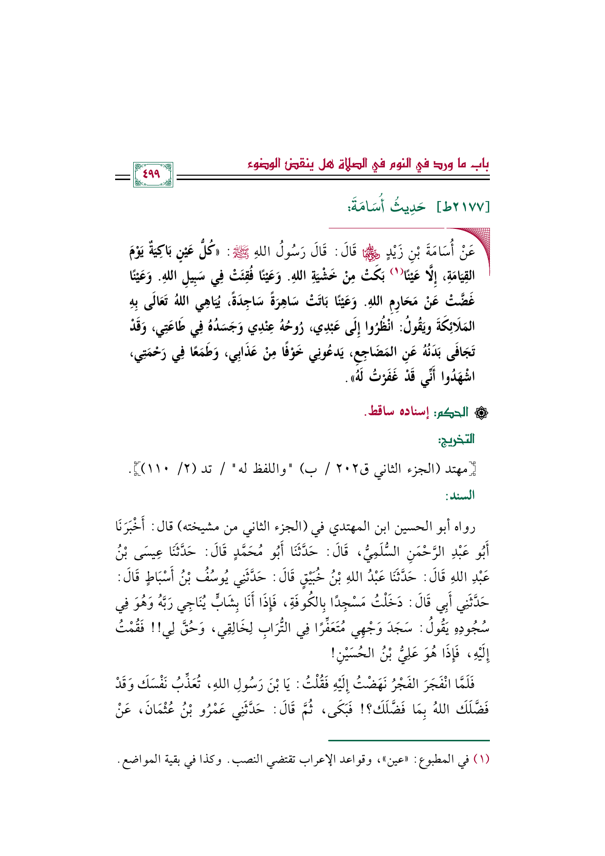 ◼ عَنْ أُسَامَةَ بْنِ زَيْدٍ رضي الله عنهما قَالَ: قَالَ رَسُولُ اللهِ صَلَّى اللهُ عَلَيْهِ وَسَلَّمَ: ((كُلُّ عَيْنٍ بَاكِيَةٌ يَوْمَ القِيَامَةِ، إِلَّا عَيْنًا (¬١) بَكَتْ مِنْ خَشْيَةِ اللهِ. وَعَيْنًا فُقِئَتْ فِي سَبِيلِ اللهِ. وَعَيْنًا غَضَّتْ عَنْ مَحَارِمِ اللهِ. وَعَيْنًا بَاتَتْ سَاهِرَةً سَاجِدَةً، يُبَاهِي اللهُ تَعَالَى بِهِ المَلَائِكَةَ ويَقُولُ: انْظُرُوا إِلَى عَبْدِي، رُوحُهُ عِنْدِي وَجَسَدُهُ فِي طَاعَتِي، وَقَدْ تَجَافَى بَدَنُهُ عَنِ المَضَاجِعِ، يَدعُونِي خَوْفًا مِنْ عَذَابِي، وَطَمَعًا فِي رَحْمَتِي، اشْهَدُوا أَنِّي قَدْ غَفَرْتُ لَهُ)).
