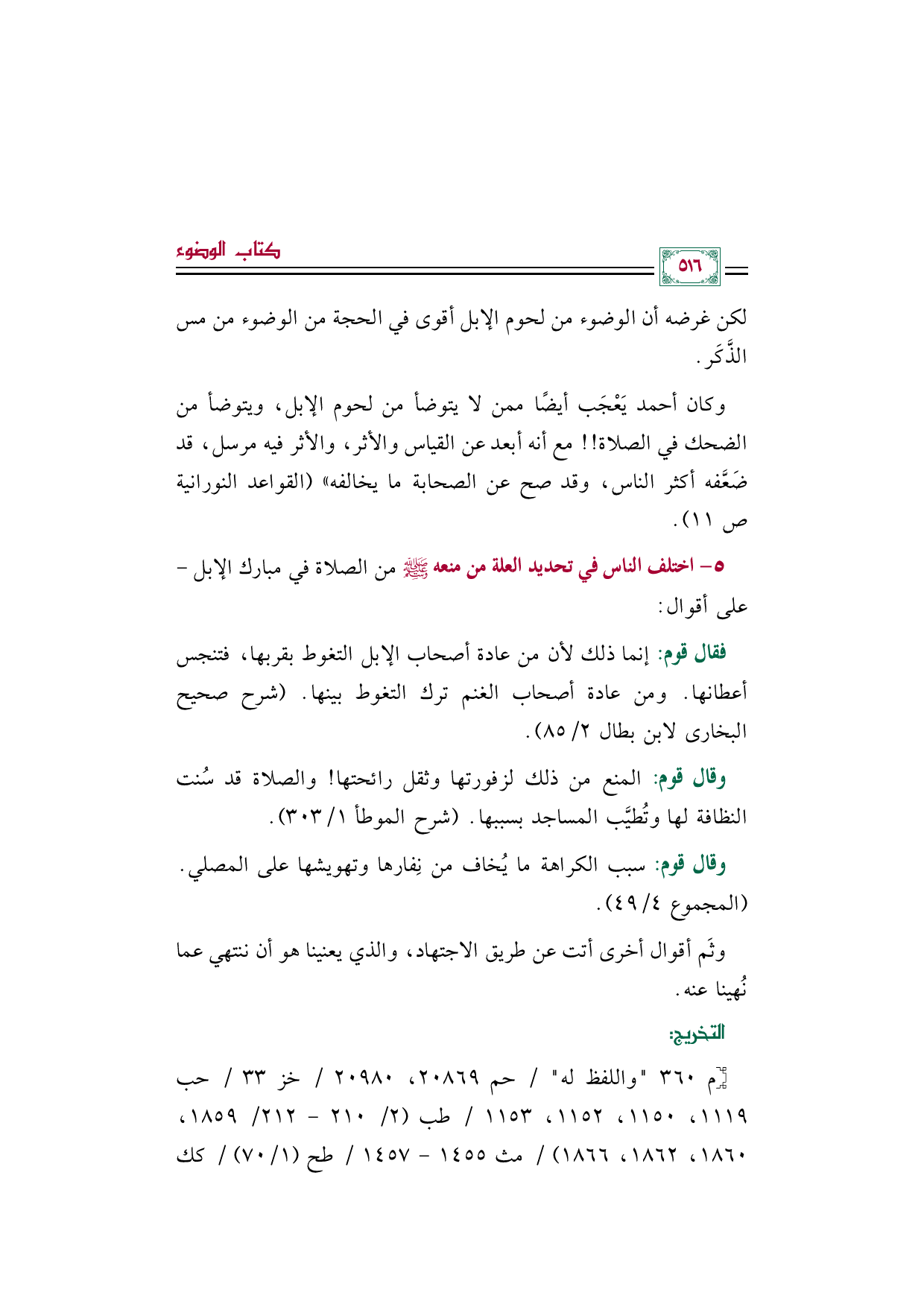 ٥ - اختلف الناس في تحديد العلة من منعه صلى الله عليه وسلم من الصلاة في مبارك الإبل- على أقوال: