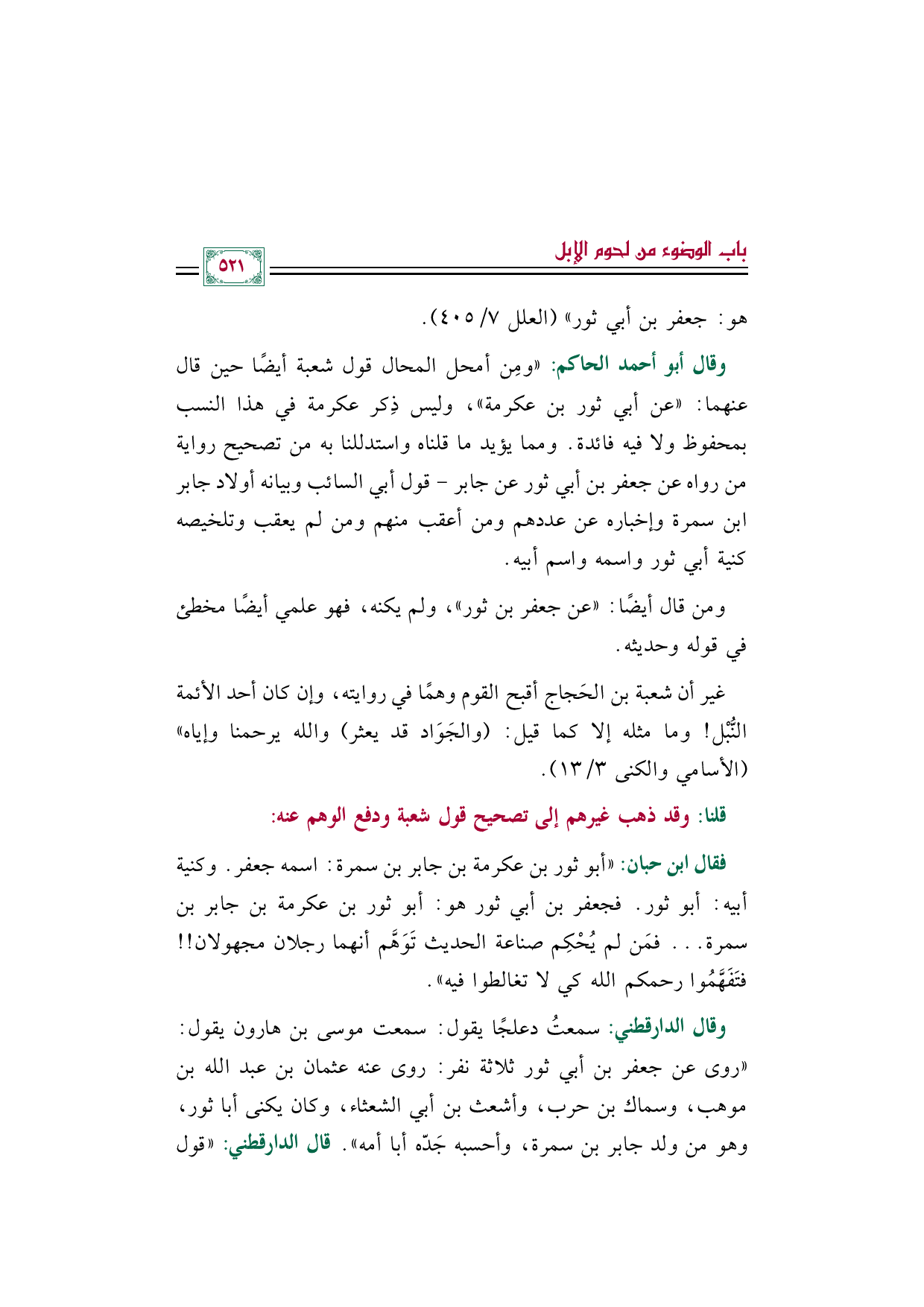 * وقال أبو أحمد الحاكم: "ومِن أمحل المحال قول شعبة أيضًا حين قال عنهما: "عن أبي ثور بن عكرمة"، وليس ذِكر عكرمة في هذا النسب بمحفوظ ولا فيه فائدة. ومما يؤيد ما قلناه واستدللنا به من تصحيح رواية من رواه عن جعفر بن أبي ثور عن جابر- قول أبي السائب وبيانه أولاد جابر بن سمرة وإخباره عن عددهم ومن أعقب منهم ومن لم يعقب وتلخيصه كنية أبي ثور واسمه واسم أبيه.