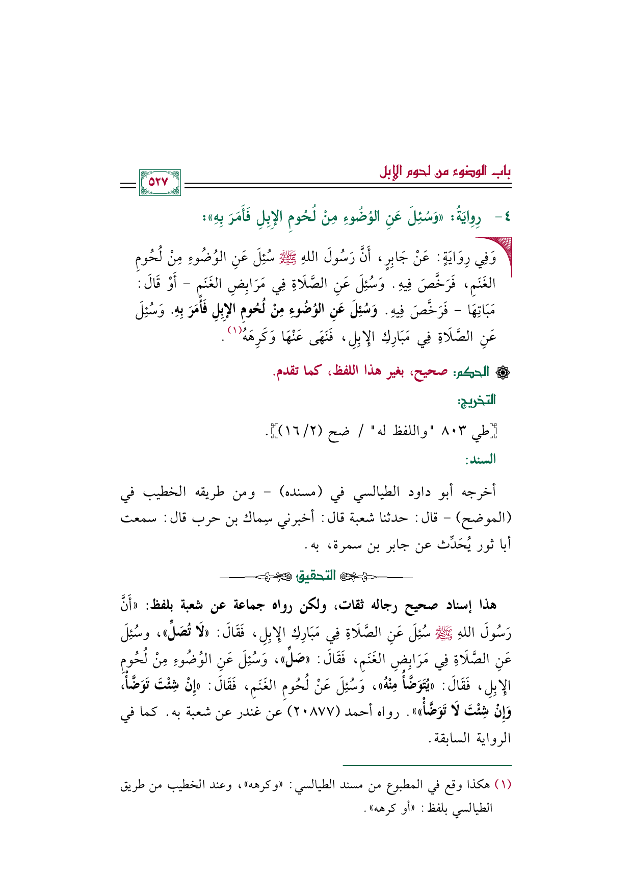 هذا إسناد صحيح رجاله ثقات، ولكن رواه جماعة عن شعبة بلفظ: ((أَنَّ رَسُولَ اللهِ صَلَّى اللهُ عَلَيْهِ وَسَلَّمَ سُئِلَ عَنِ الصَّلَاةِ فِي مَبَارِكِ الإِبِلِ، فَقَالَ: " لَا تُصَلِّ "، وسُئِلَ عَنِ الصَّلَاةِ فِي مَرَابِضِ الغَنَمِ، فَقَالَ: " صَلِّ "، وَسُئِلَ عَنِ الوُضُوءِ مِنْ لُحُومِ الإِبِلِ، فَقَالَ: " يُتَوَضَّأُ مِنْهُ "، وَسُئِلَ عَنْ لُحُومِ الغَنَمِ، فَقَالَ: " إِنْ شِئْتَ تَوَضَّأْ، وَإِنْ شِئْتَ لَا تَوَضَّأْ")). رواه أحمد (٢٠٨٧٧) عن غندر عن شعبة به. كما في الرواية السابقة.